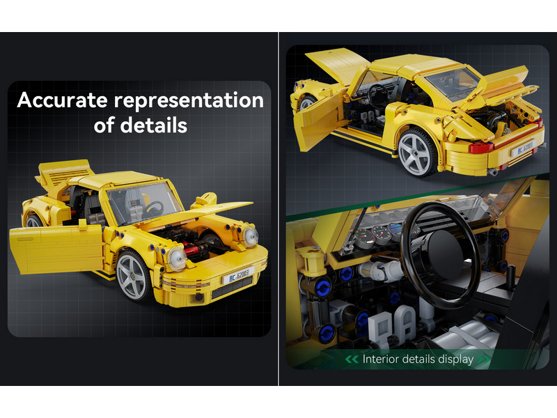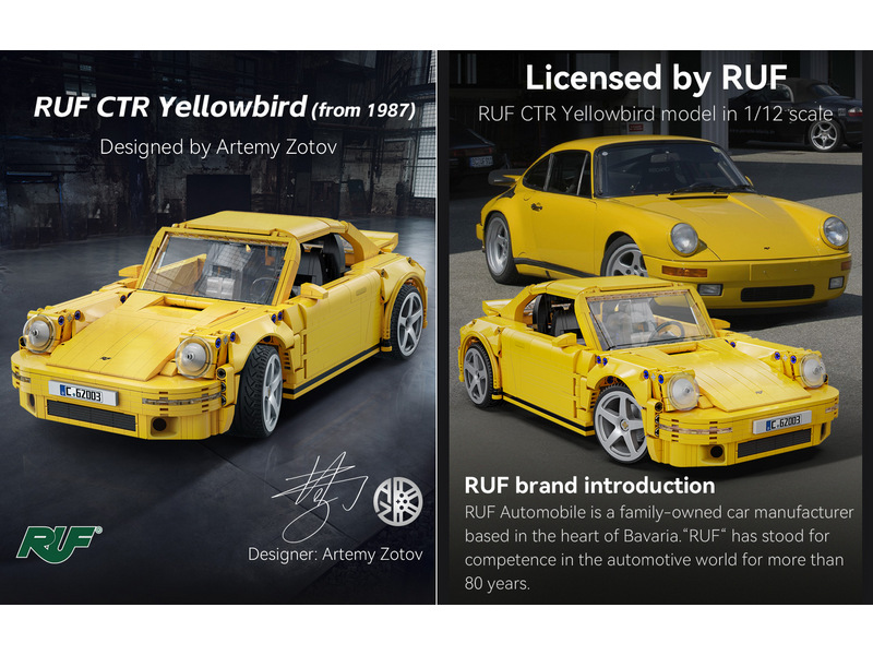 Конструктор от CADA для постройки спорткара RUF CTR Yellowbird в масштабе 1/12. C62003W — это официально лицензированная модель в масштабе 1:12 от Артемия Зотова, шедевра дизайна и инженерии.