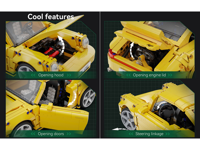 Погрузитесь в искусно спроектированный отсек двигателя, полный движущихся поршней, через открывающийся капот. Исследуйте тщательно проработанный интерьер с открывающимися дверями. Кроме того, RUF CTR Yellowbird может похвастаться функциональной передней и задней подвеской, что обеспечивает реалистичное движение и управляемость.