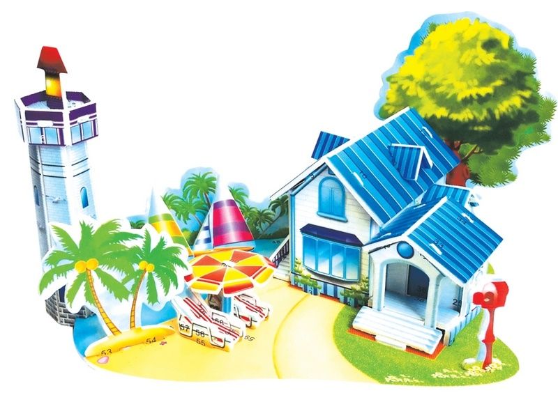 Из деталей 3Д пазла "Романтический пляж" можно собрать модель романтического пляжа с пальмами. На пляже стоит спасательная станция, домик для отдыхающих, шезлонг для желающих полежать на берегу. Для комфортного отдыха над шезлонгами установлена зонтики от солнца.