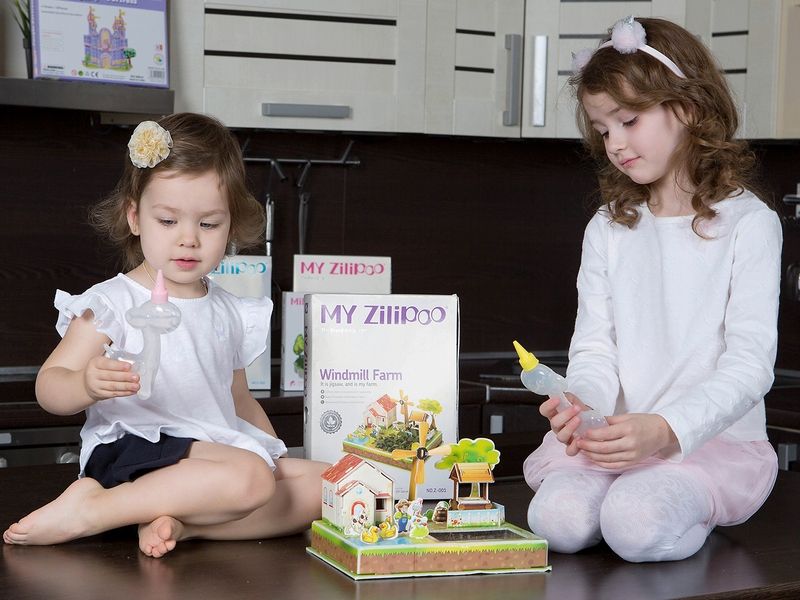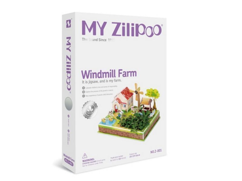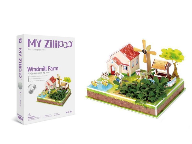 Из деталей 3Д пазла "Ферма и ветряная мельница" можно собрать ветряную мельницу и ферму. Ферма располагается в уютном месте на берегу пруда. На территории фермы располагается колодец, окруженный забором, растут деревья и есть место для клумбы.