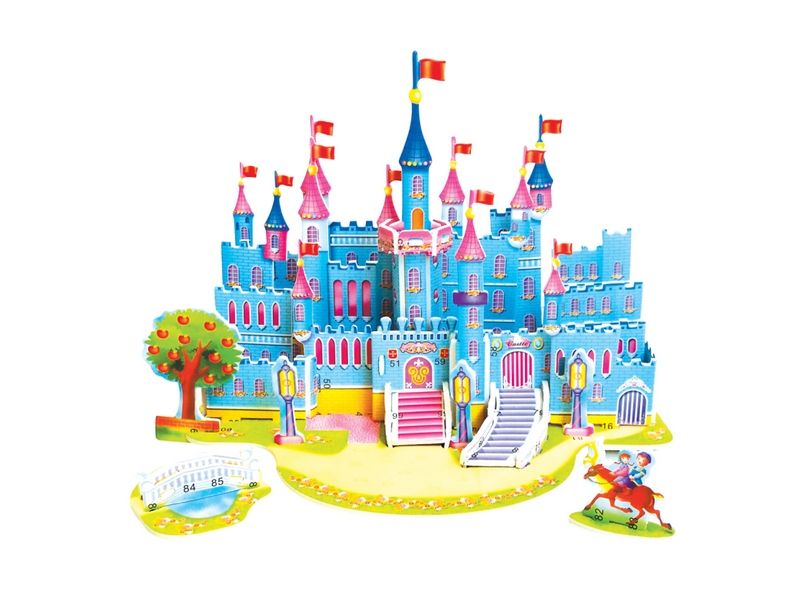 Из деталей 3Д пазла "Голубой замок" можно собрать великолепный голубой замок, на башнях которого развеваются флаги. Ко входам ведут лестницы. Рядом с замком небольшой пруд, через который можно перейти по мосту.