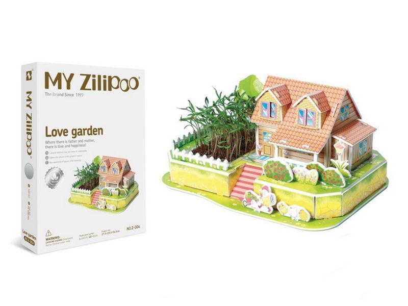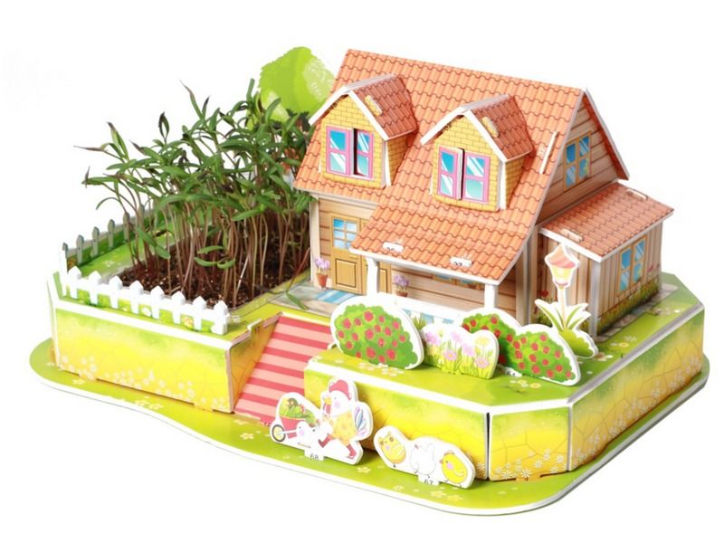 Из деталей 3Д пазла "Любимый сад" можно собрать красивый дом с мансардой. Дом располагается на небольшой возвышенности, подняться к нему можно по удобной лестнице. Сделать территорию рядом с домом еще красивее и уютнее можно, вырастив свою собственную клумбу. Для этого в наборе есть семена и специальный грунт. Для полива есть оригинальная лейка.