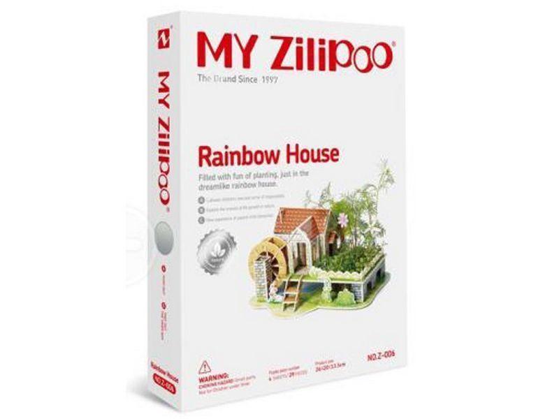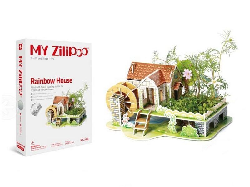 Из деталей 3Д пазла "Радужный дом" можно собрать стильный и красивый дом c собственной мельницей. Дом располагается в райском уголке, утопающем в зелени. Под домом течет ручей.Также можно вырастить своими руками клумбу. В наборе для этого есть грунт и семена. Уход за клумбой доставит только приятные впечатления, ведь в наборе есть оригинальная лейка для полива. Карту-дневник из набора можно поставить на стол и фиксировать в ней весь процесс выращивания клумбы.