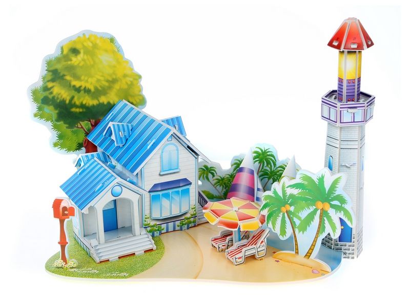 Из деталей 3Д пазла "Романтический пляж" можно собрать модель романтического пляжа с пальмами. На пляже стоит спасательная станция, домик для отдыхающих, шезлонг для желающих полежать на берегу. Для комфортного отдыха над шезлонгами установлена зонтики от солнца. В роли инструкции выступает нумерация на деталях, которая определяет ход сборки. Благодаря качественной подгонке детали легко соединяются между собой, при этом готовый пазл достаточно устойчив и может использоваться для дальнейших сюжетных игр.