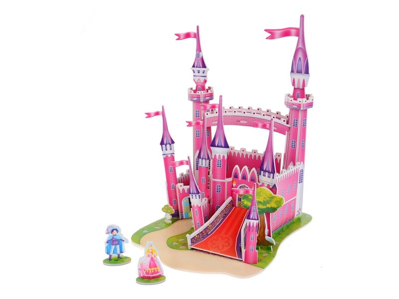 Из деталей 3Д пазла "Розовый замок" можно собрать красивый розовый замок принцессы, а также фигурки принца и принцессы. Ворота замка, центральный въезд на его территорию, флаги на башнях, деревья вокруг - все выполнено с максимальной детализацией. Порядок сборки определяется маркировкой на деталях.