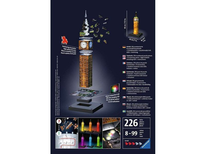 Ravensburger представляет совершенно новую концепцию сборки пазлов 3D с использованием новейших технологий. В этой головоломке используются уникальные навесные пластиковые детали, которые соединяются друг с другом для сборки прочного «здания» без клея. Головоломка имеет 226 высококачественных пластиковых деталей для сборки ночного Биг Бен, из которых 216 - пазлы, 9 элементов конструкции и светодиодный модуль. Каждый элемент пазла пронумерован на оборотной стороне для удобства последовательной сборки. Яркая подсветка имеет несколько цветов.