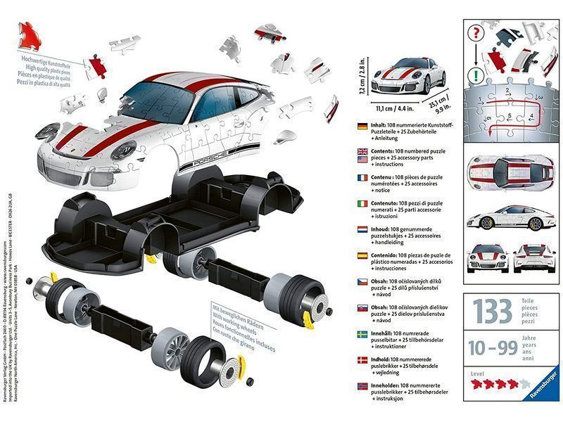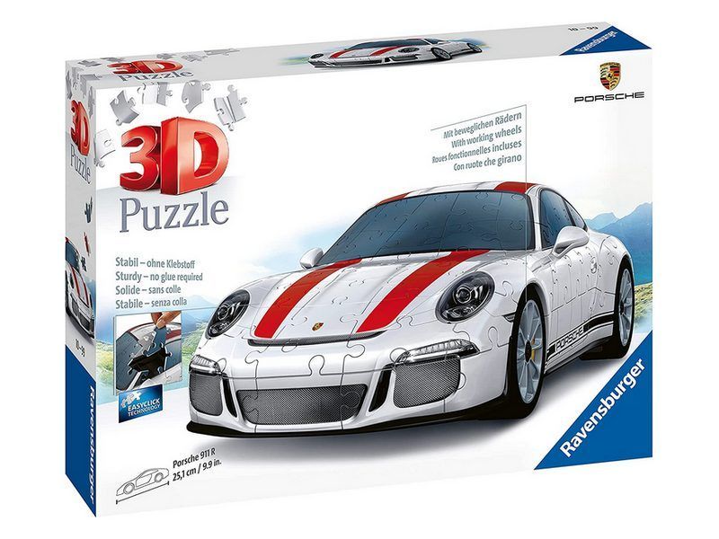 C помощью 3D головоломки вы можете собрать свою собственную версию легендарного гоночного автомобиля Porsche 911R. Такой 3D пазл станет отличной идеей подарка для всех поклонников Porsche! 108 прочных пластиковых элементов 3D пазла имеют индивидуальную форму, частично изгибаются и идеально сочетаются с технологией Easyclick - без клея! Яркой особенностью 3D пазла являются вращающиеся колёса.