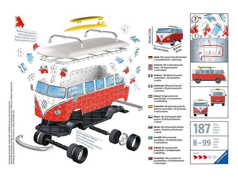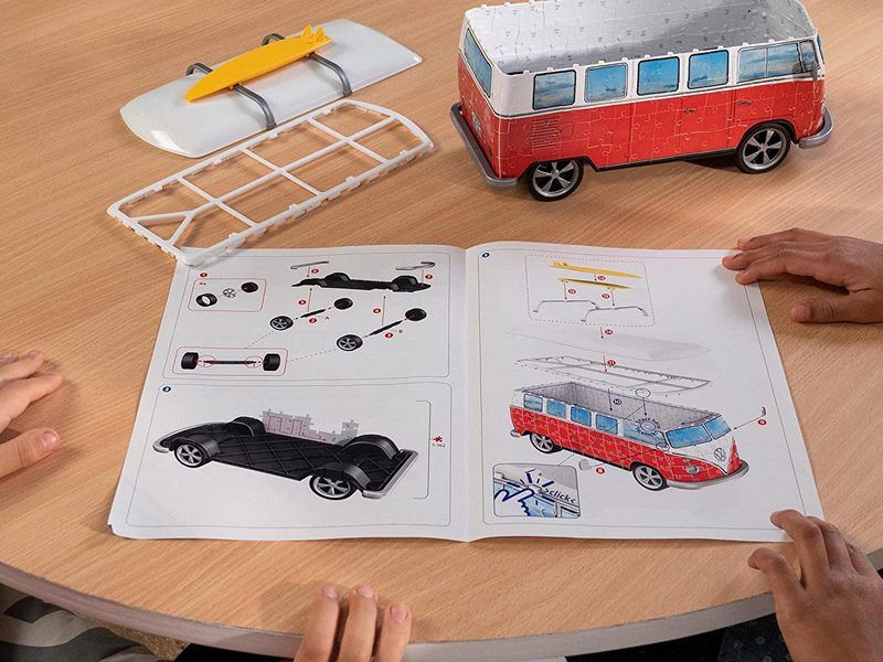 Перед вами открывается возможность собрать модель автобуса Volkswagen. Эта высокодетализированная модель идеально подходит для коллекционеров и любителей пазлов. В этой головоломке используются уникальные пластиковые детали, которые соединяются вместе для создания прочной модели без применения клея. На оборотной стороне каждого элемента пазла размещен номер, помогающий сложить пазл. Кроме того, в наборе присутствуют элементы конструкции автобуса, соединяющие модель воедино.
