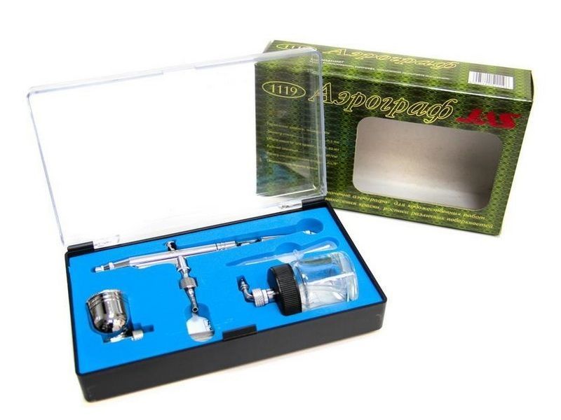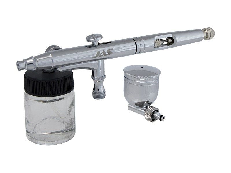 Продолжение линейки аэрографа JAS 1113. Универсальная модель, которой можно рисовать под любым углом наклона к поверхности, а также быстро переходить от одного цвета краски к другому, меняя сменные емкости с краской нужного цвета без полной промывки аэрографа.