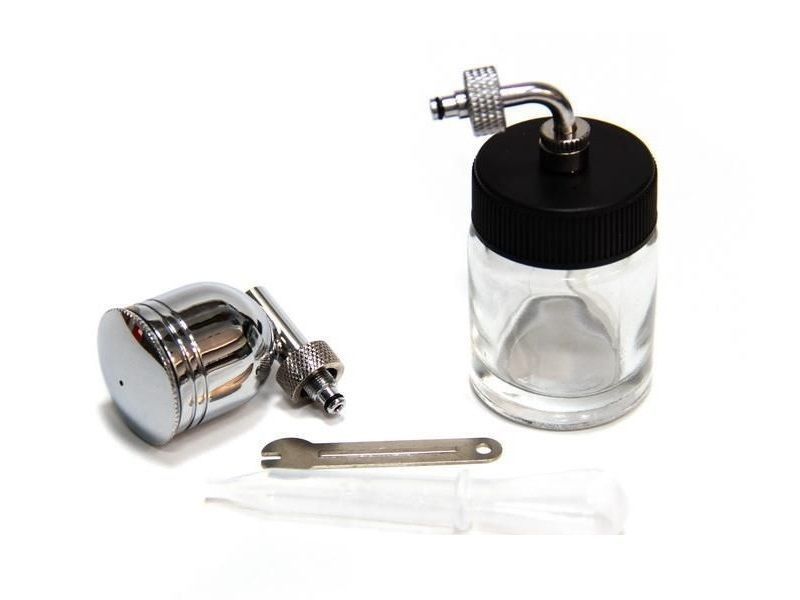 В комплекте идут две сменные емкости для краски - одна металлическая объемом 7 мл с резьбовым креплением и крышкой, вторая - стеклянная 22 мл также с резьбовым креплением. Резьбовое крепление делает крепление емкости к аэрографу более надежным.