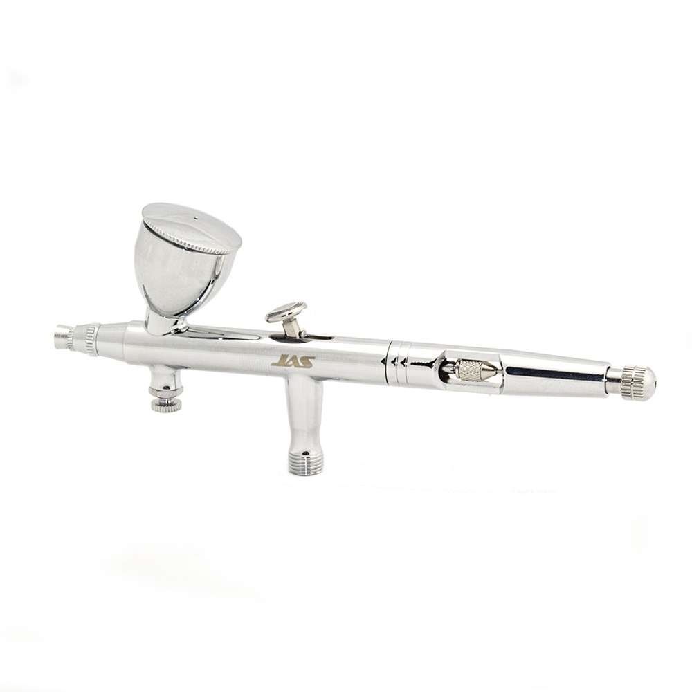 Удобные сменные емкости для краски устанавливаются сверху: 2 мл, 5 мл и 13 мл. В аэрографе установлено сопло 0.3 мм, толщина линий от 1 мм до 30 мм. Возможна установка сопла 0,2 мм для получения более узкого факела распыла, линии от 0,5 мм. Также можно поставить более широкое сопло до 0.8 мм для получения более широко распыла.