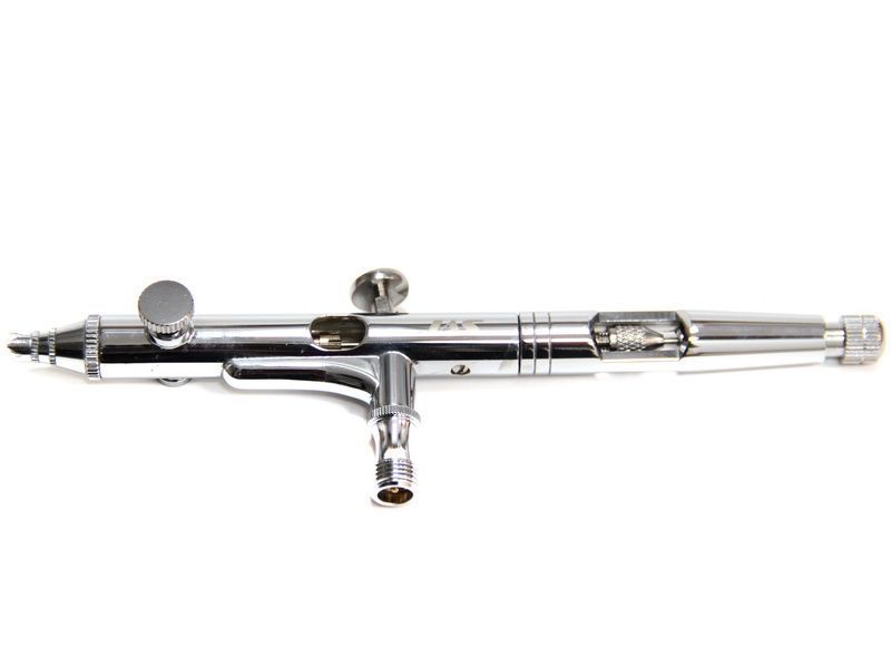 Объем боковой емкости - 5 мл (съемная металлическая с крышкой). Емкость можно устанавливать под любым углом как слева, так и справа от аэрографа. Штатно стоит резьбовое сопло универсального диаметра - 0.3 мм, для рисования тонких линий его можно заменить на сопло меньшего диаметра 0.2 мм.