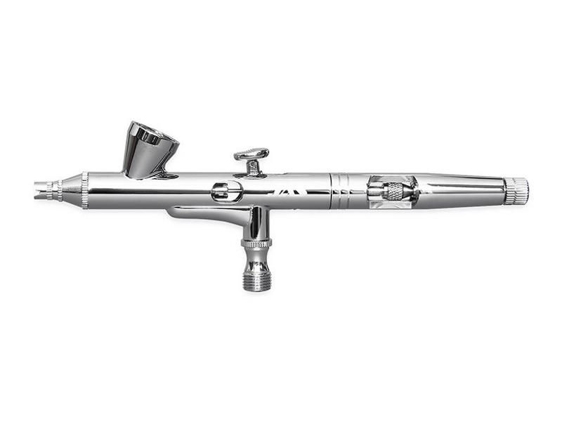 Профессиональный аэрограф широкого спектра применения. В комплекте ёмкость под краску 2 мл. Ограничитель максимальной подачи краски. Быстрое открытие сопла для сброса сгустков краски. В комплекте также штуцер для подключения воздушного шланга без резьбового соединения, ключ для замены сопла, пипетка.