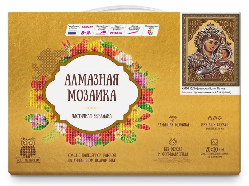 С помощью набора для творчества из мозаичных элементов можно выложить из мозаики икону "Вифлеемская божия матерь". Существуют свидетельства, благодаря которым стало известно, что риза иконы в свое время была изготовлена из отреза платья княгини Елизаветы. Лицо Девы Марии озаряет улыбка. Левая рука сына Девы Марии лежит на державе. Вифлеемская икона Божией Матери имеет уникальную композицию за счет того, что украшена ризой.