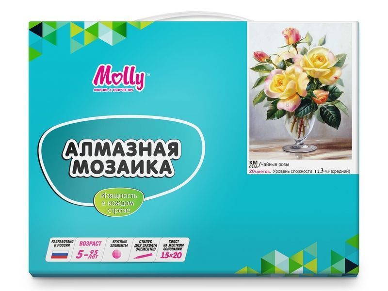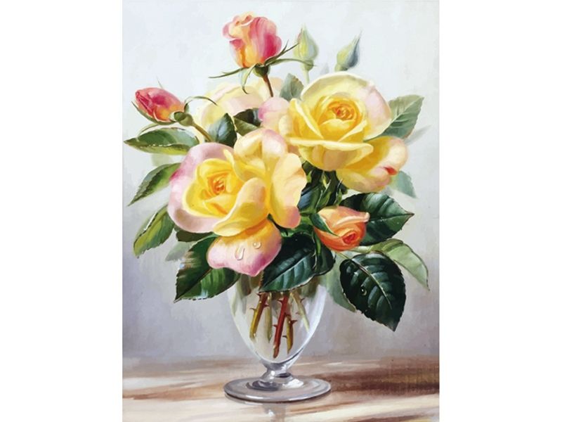 В наборе Чайные розы из мозаичных элементов можно выложить прекрасные розы в вазе - одного из самых популярных цветов на Земле. Диаметр самого крупного цветка составляет 83 сантиметра. Диаметр самого маленького цветка не превышает размеров рисового зерна. При этом выкладывать нужно не полностью весь холст, как в случае с полной выкладкой, а только его часть.