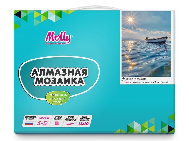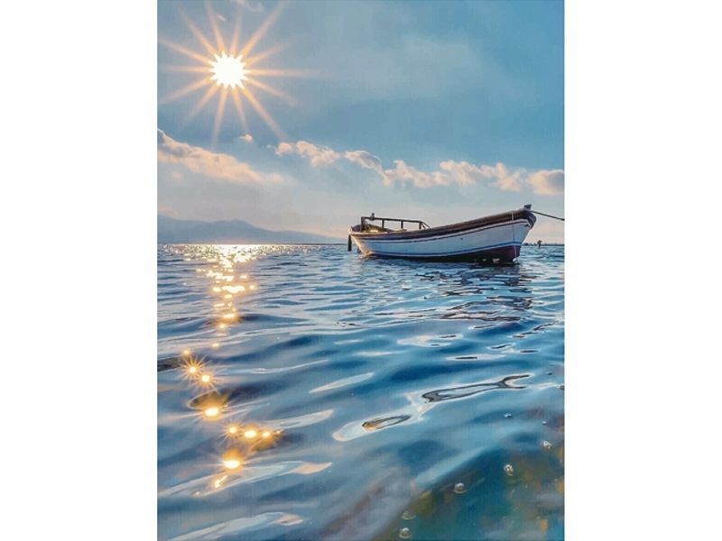 В наборе Лодка на рассвете из мозаичных элементов можно выложить морской пейзаж, горы вдали, блики солнца на поверхности воды. При этом выкладывать нужно не полностью весь холст, как в случае с полной выкладкой, а только его часть.