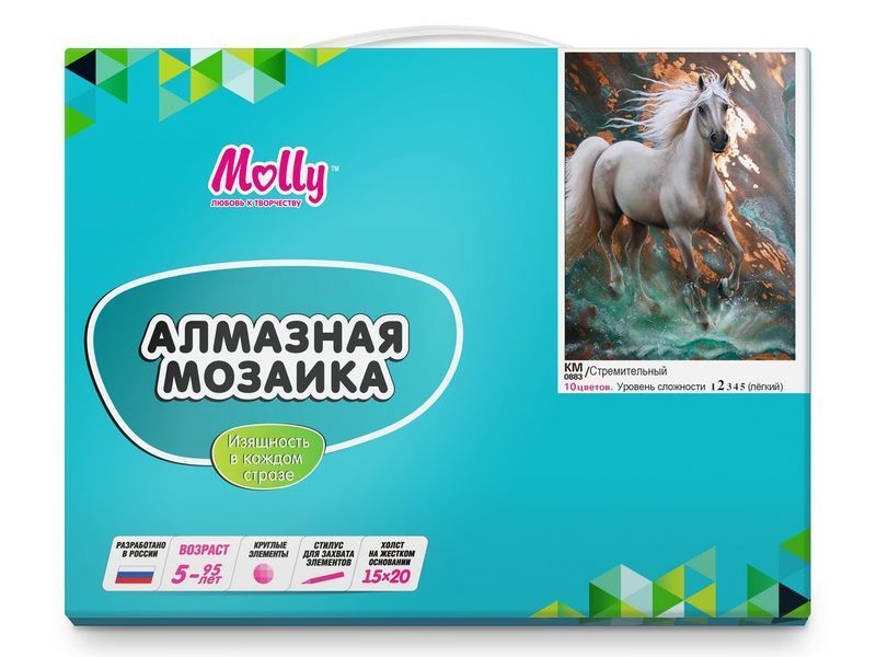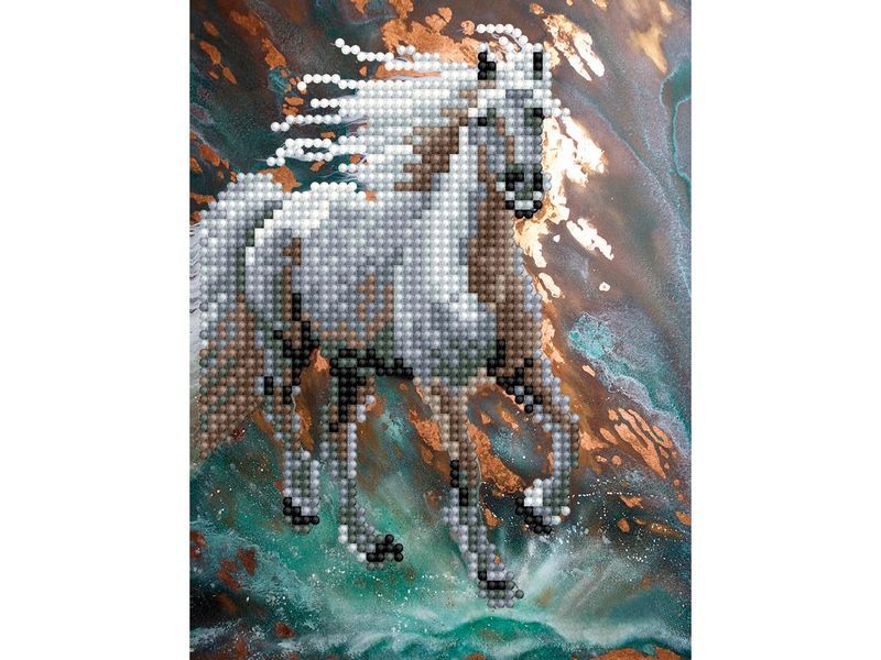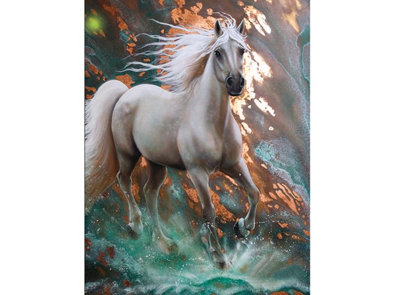 В наборе Стремительный из мозаичных элементов можно выложить картину в стиле фэнтези с изображением коня, стремительного мчащегося вдаль. На ветру развивается его грива, брызги воды разлетается в стороны. При этом выкладывать нужно не полностью весь холст, как в случае с полной выкладкой, а только его часть.