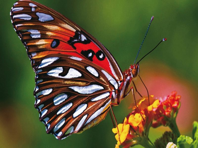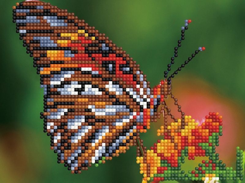 В наборе Яркая бабочка из мозаичных элементов можно выложить изображение бабочки, с необыкновенным узором на крыльях, сидящей на ярко-оранжевом цветке. При этом выкладывать нужно не полностью весь холст, как в случае с полной выкладкой, а только его часть.