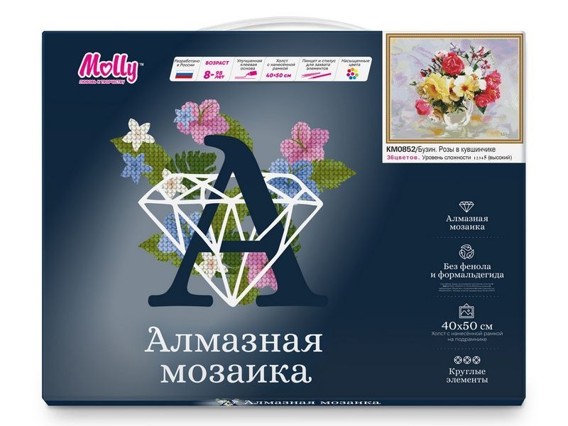 Алмазная мозаика - наборы, в которых желаемое изображение выкладывается на основе со схемой рисунка при помощи специальных декоративных элементов. Подсказка в виде нанесенного контура существенно облегчает задачу и дает возможность создавать картину даже людям, не имеющим художественных навыков. Готовая картина переливается на свету всеми цветами радуги. К тому же, принцип рисования по номерам, заложенный в основу создания алмазной мозаики, делает такое творчество доступным каждому и исключает неудачи.
