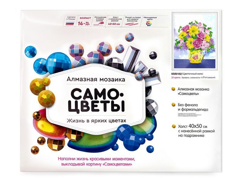 Алмазная мозаика - наборы, в которых желаемое изображение выкладывается на основе со схемой рисунка при помощи специальных декоративных элементов. Подсказка в виде нанесенного контура существенно облегчает задачу и дает возможность создавать картину даже людям, не имеющим художественных навыков. Готовая картина переливается на свету всеми цветами радуги. В наборе "Цветочный микс" из мозаичных элементов можно выложить яркий букет цветов вазе.