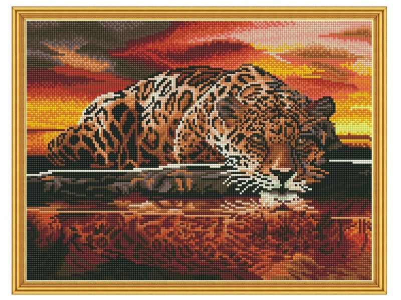 В наборе "Ягуар" из мозаичных элементов можно выложить картину с изображением хищника под огненно-красным небом.