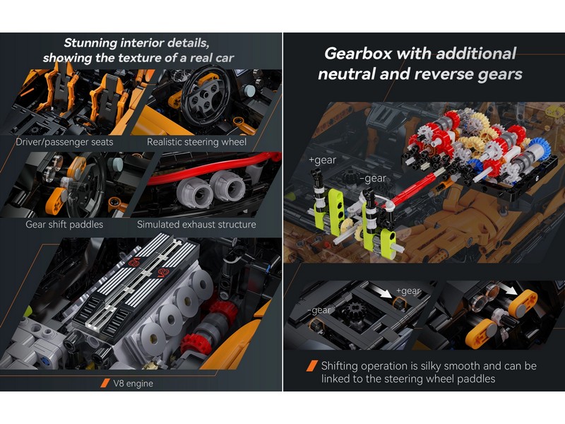 Модель обеспечивает реалистичное вождение благодаря независимой передней и задней подвеске, а также детализированному двигателю V8 с движущимися поршнями. Инновационный механизм открывания дверей позволяет плавное автоматическое раскрытие, добавляя изысканность в общий дизайн. Внутренняя и наружная отделка модели выполнены с высокой степенью детализации, что устанавливает новый стандарт в области мастерства и производительности.