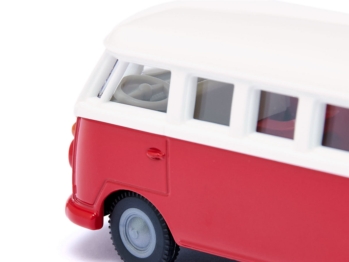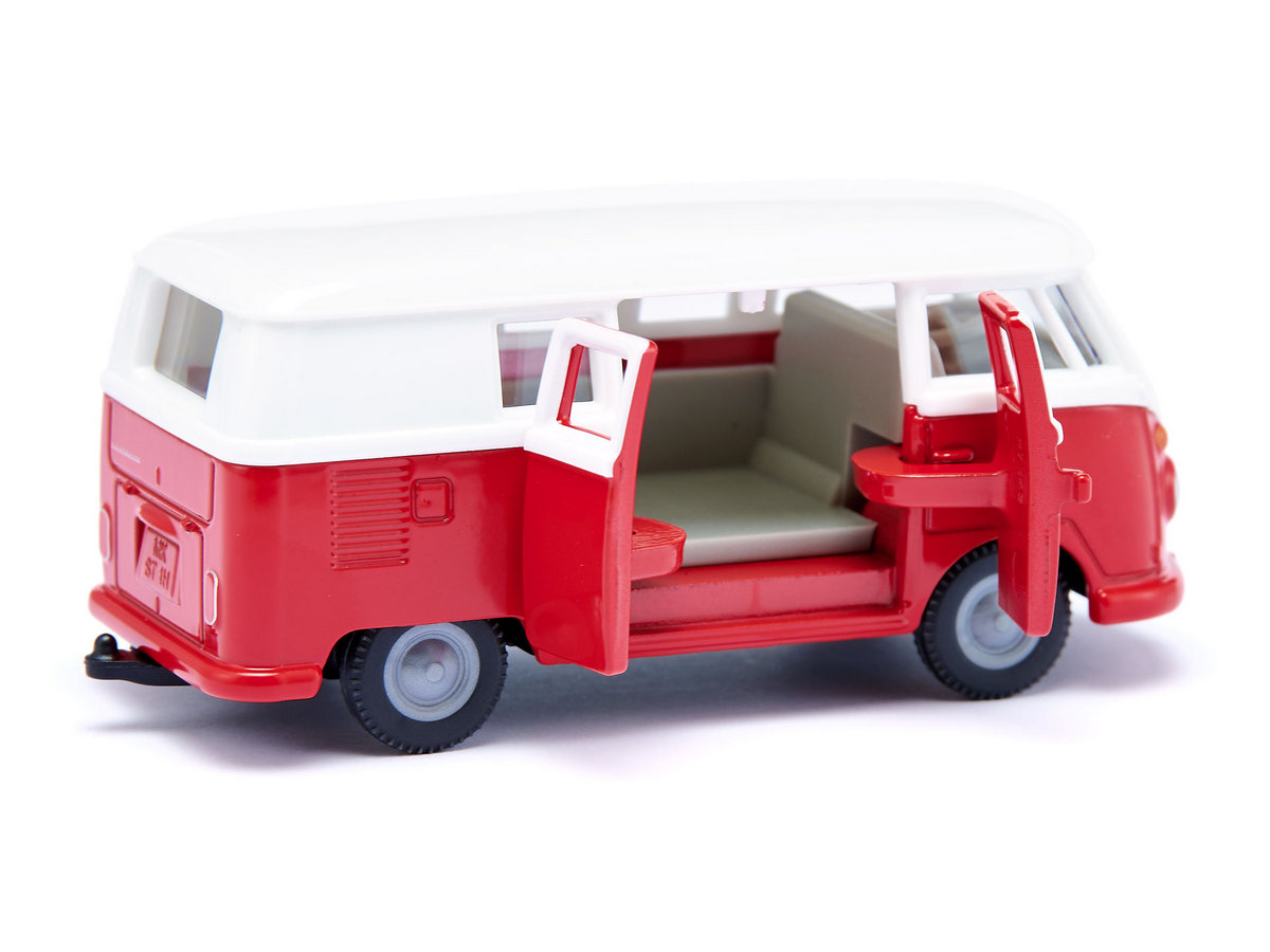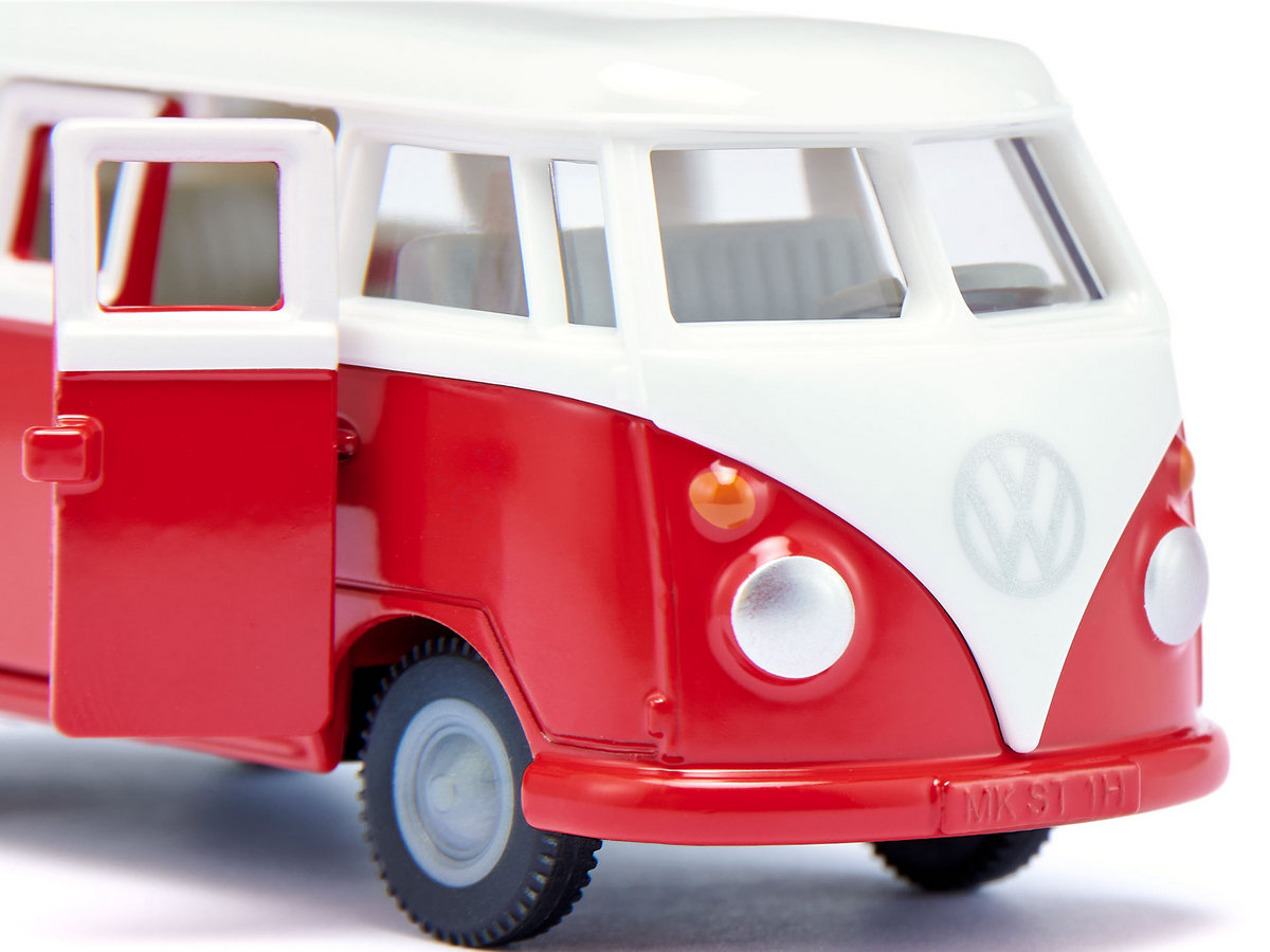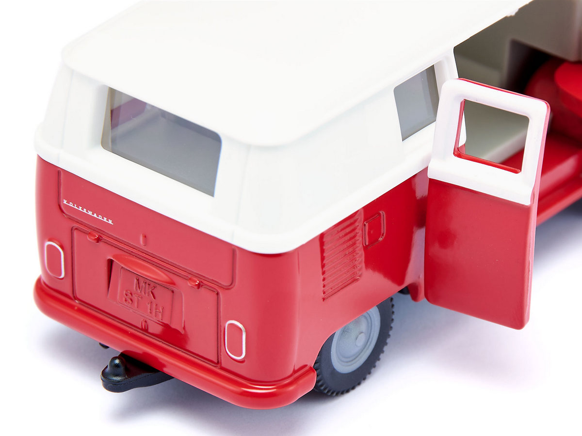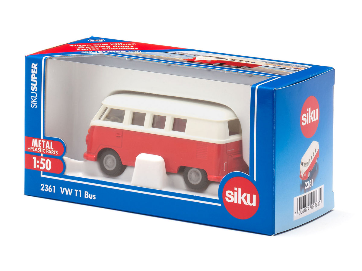 Volkswagen T1 - это больше, чем просто автомобиль – это легенда! История успеха немецкого микроавтобуса, которого фанаты ласково называют „Булли“, началась еще в 1950-х годах. Он считался символом немецкого экономического чуда, в США модель была культовой среди хиппи. Его округлый дизайн с блестящим лаком и хромированными бамперами до сих пор привлекает большое количество поклонников своим винтажным характером. Как модель siku, культовый автобус VW T1, конечно же, представлен в характерном бело-красном цветовом сочетании с верными оригиналу колесами. Кузов и двери выполнены из металла, кузов - из пластика. С правой стороны автомобиля можно открыть две двери. Благодаря сцепному устройству T1 можно комбинировать со многими прицепами.