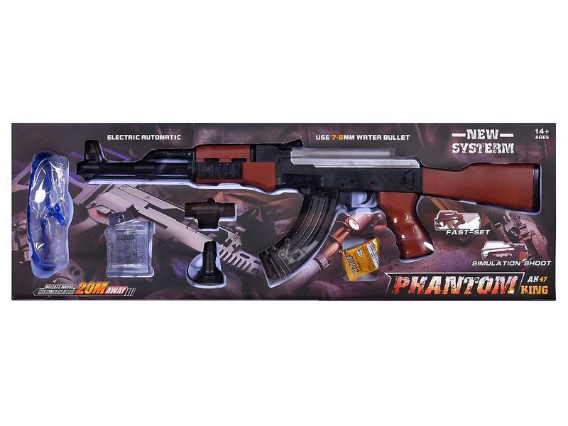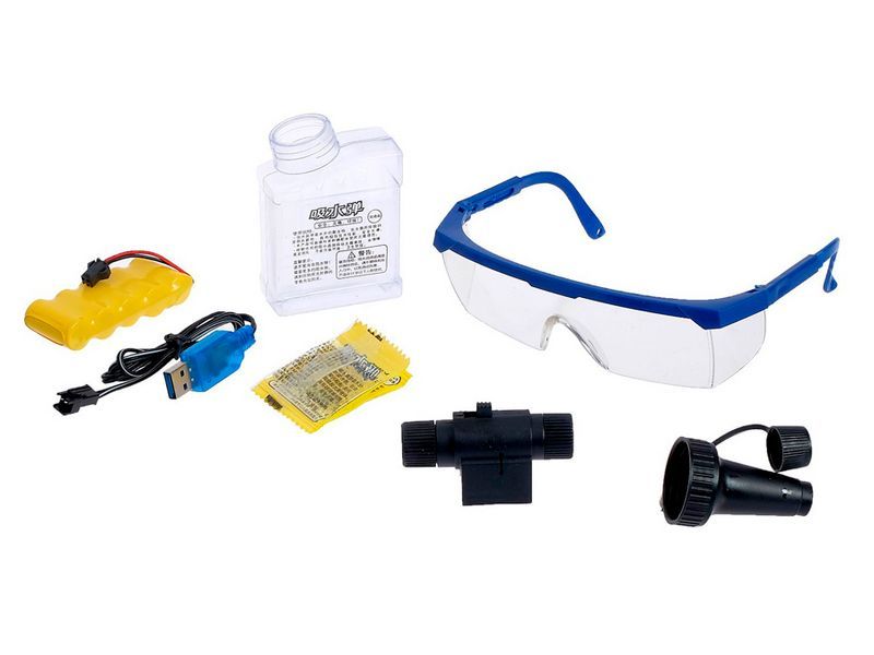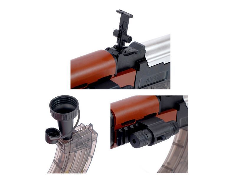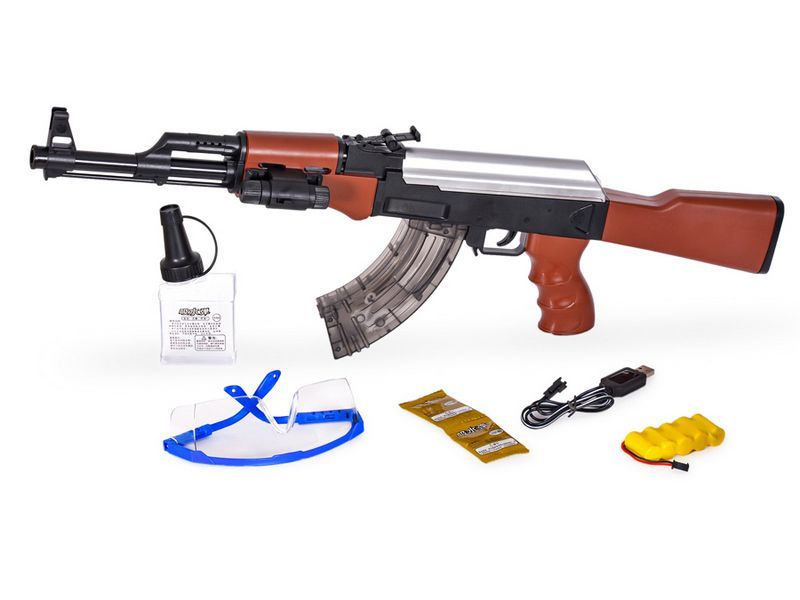 Детский электропневматический автомат на гидрогелевых пулях на аккумуляторе. Имеет 2 режима стрельбы. Игрушечный автомат изготовлен из высококачественного пластика. Автомат укомплектован лазерным прицелом (целеуказатель), который размещается на боковую планку автомата. Так же в комплекте прилагаются защитные очки для безопасной стрельбы. Надежный пневмоэлектрический механизм создает компрессию при выстреле, что позволяет стрелять на расстояние до 15 метров.