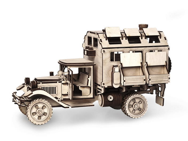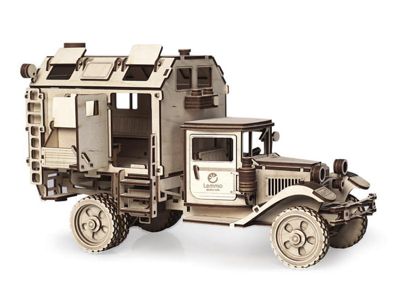Деревянный 3D конструктор Lemmo Грузовик Кунг. Детали конструктора выполнены из качественной древесины. Набор укомплектован клеем ПВА и наждачной бумагой. В результате сборки получается полноценная красивая игрушка с подвижными элементами. После сборки при желании можно раскрасить акриловыми и гуашевыми красками.