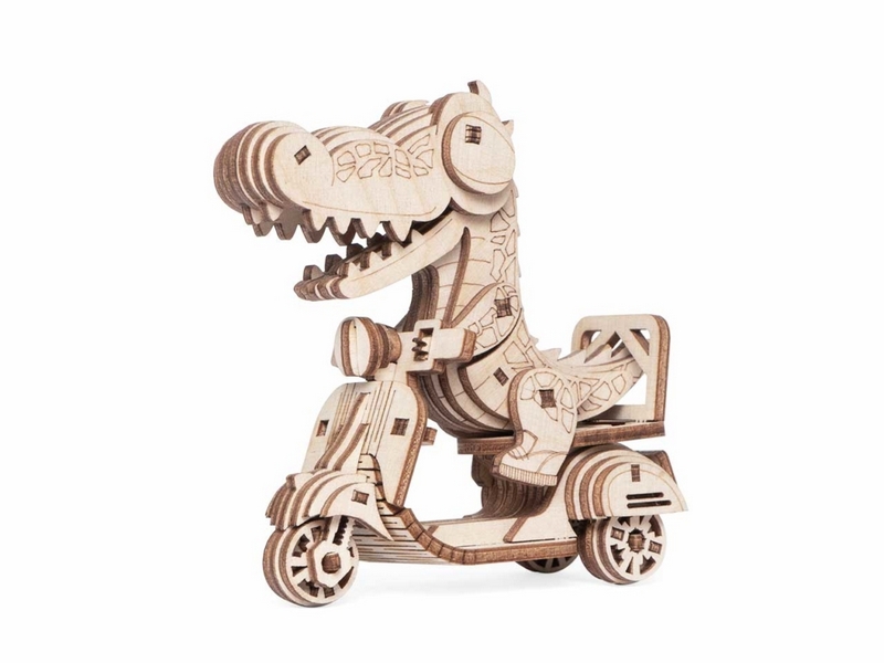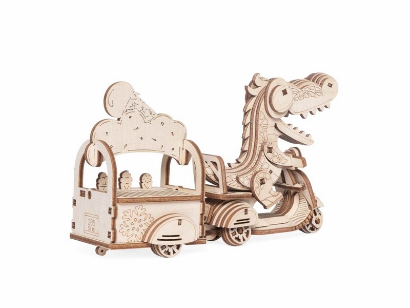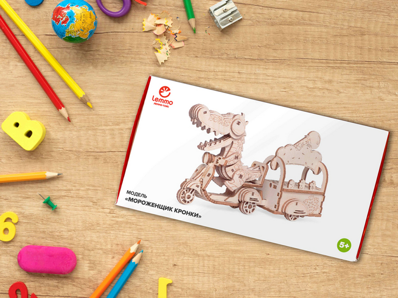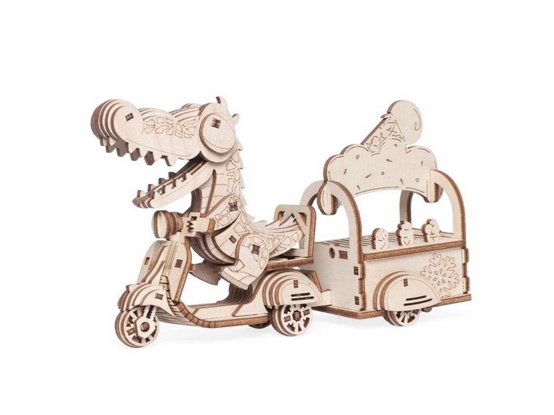 Деревянный 3D конструктор Lemmo Модель "Мороженщик Кронки". Детали конструктора выполнены из качественной древесины. Набор укомплектован наждачной бумагой. В результате сборки получается полноценная красивая игрушка с подвижными элементами. У собранной модели двигаются лапы, открывается пасть. У мопеда с прицепом вращаются колеса, открывается крышка прицепа. При желании игрушку можно раскрасить акриловыми красками.