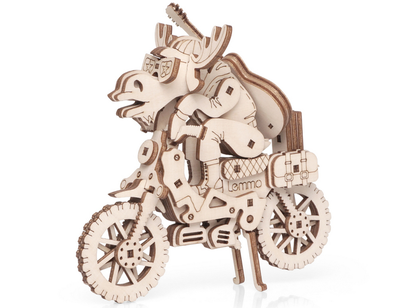 Деревянный 3D конструктор Lemmo Модель "Мотолось". Детали конструктора выполнены из качественной древесины. Набор укомплектован наждачной бумагой. В результате сборки получается полноценная красивая игрушка с подвижными элементами. У собранного мотоцикла вращаются колёса и выдвигается подножка. У лося двигаются «руки». Также модель имеет три съемных элемента: лось, гитара и колонка. При желании игрушку можно раскрасить акриловыми красками.