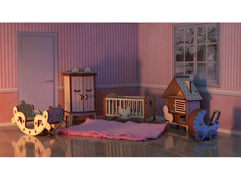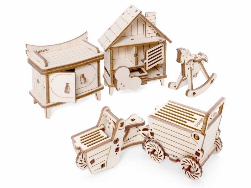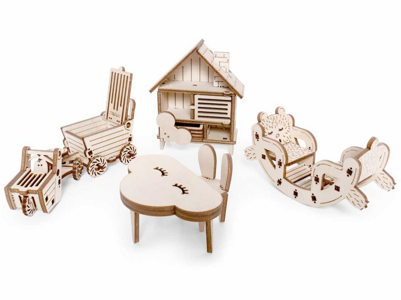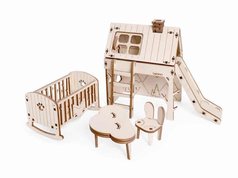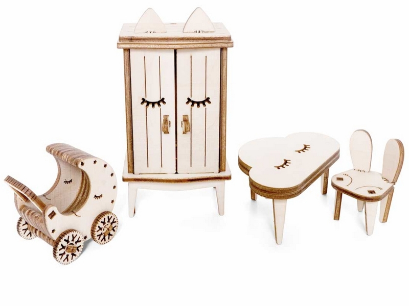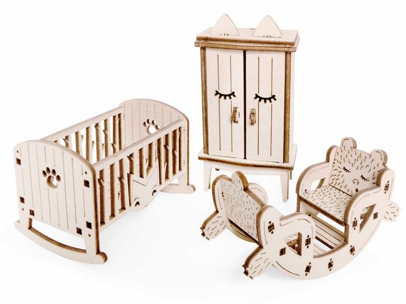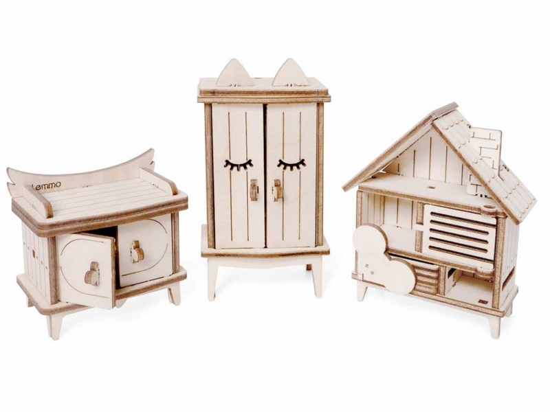 Деревянный 3D конструктор Lemmo Набор мебели "Детская". Детали конструктора выполнены из качественной древесины. Набор укомплектован наждачной бумагой. В результате сборки получается большой набор мебели для детской комнаты с подвижными элементами, в который входят горка, шкаф, комод, стеллаж, кроватка, коляска, столик, стульчик, коняшка, качель-мишка, беговел с прицепом. Открываются дверцы шкафчиков, крутятся колёса. При желании можно раскрасить акриловыми красками.