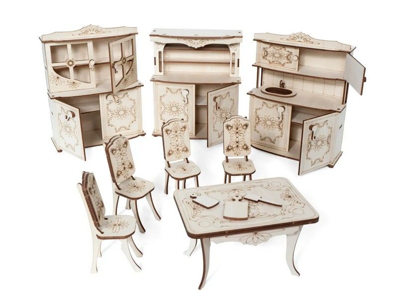 Деревянный набор мебели Lemmo "Кухня". Все детали выполнены из качественной древесины. Набор укомплектован клеем ПВА и наждачной бумагой. В результате сборки получается полноценная красивая игрушка с подвижными элементами. После сборки при желании можно раскрасить акриловыми и гуашевыми красками.