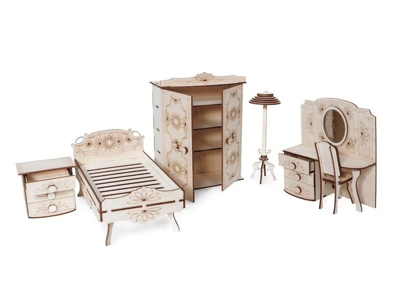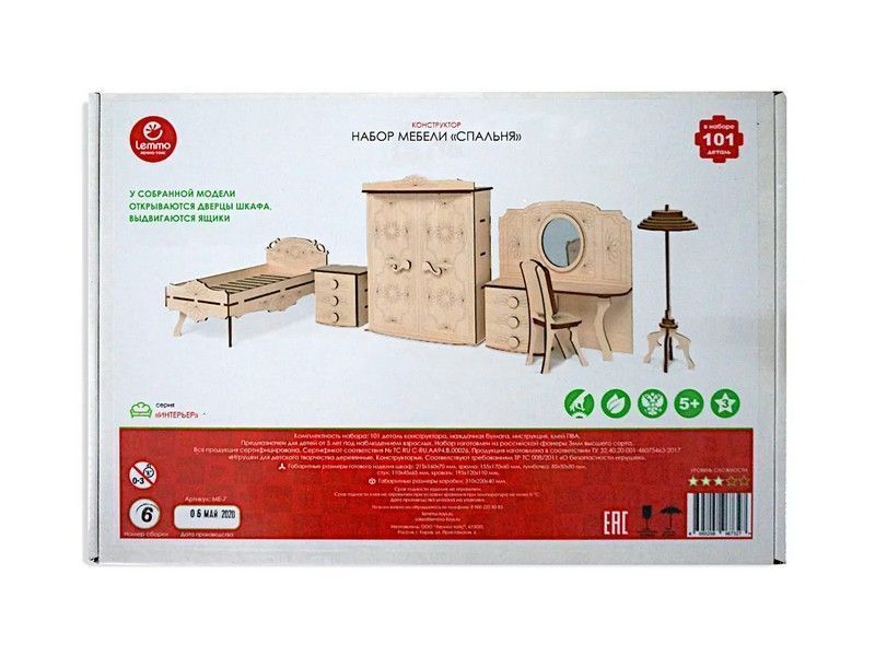 Деревянный набор мебели Lemmo "Спальня". Все детали выполнены из качественной древесины. Набор укомплектован клеем ПВА и наждачной бумагой. В результате сборки получается полноценная красивая игрушка с подвижными элементами. После сборки при желании можно раскрасить акриловыми и гуашевыми красками.