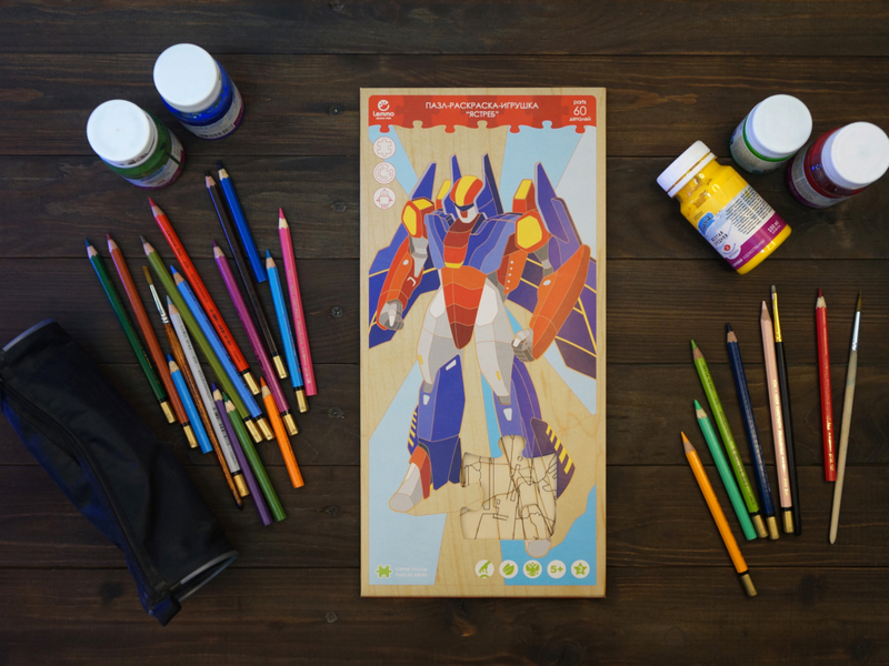 Деревянный 3D конструктор Lemmo Пазл-раскраска-игрушка "Ястреб". Этот набор интересен своей многогранностью. Это не просто пазл, который надо собрать, это пазл, который надо прежде всего раскрасить. Для этого подойдут и краски, и карандаши, и самоклеящаяся пленка. Вы получаете пазл "вашего" цвета. Но и это не все...Из отдельных деталей пазла вы соберёте невероятную модель, которая из робота трансформируется в истребитель!