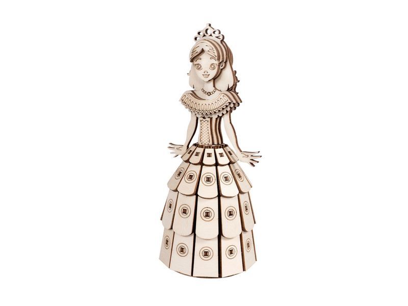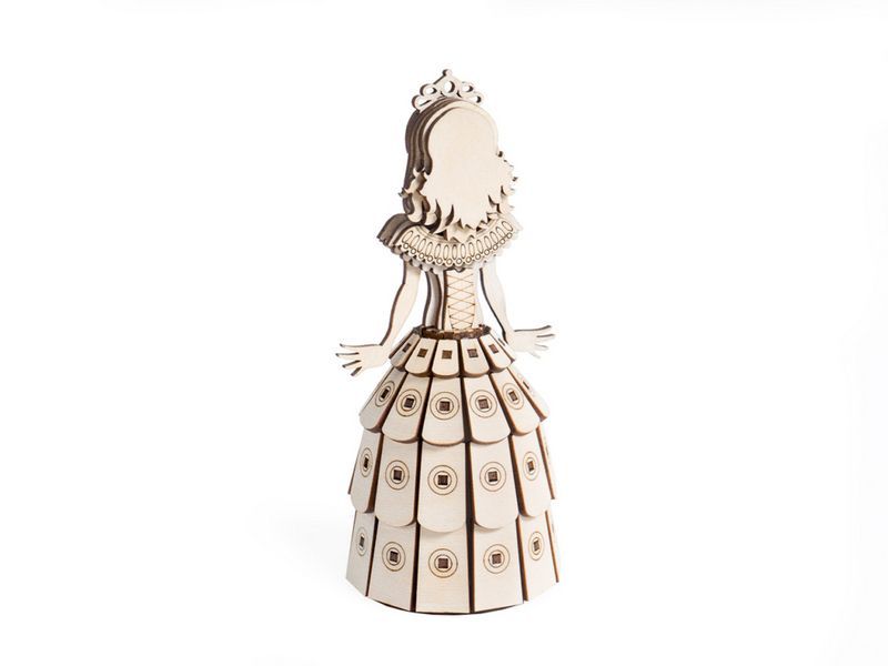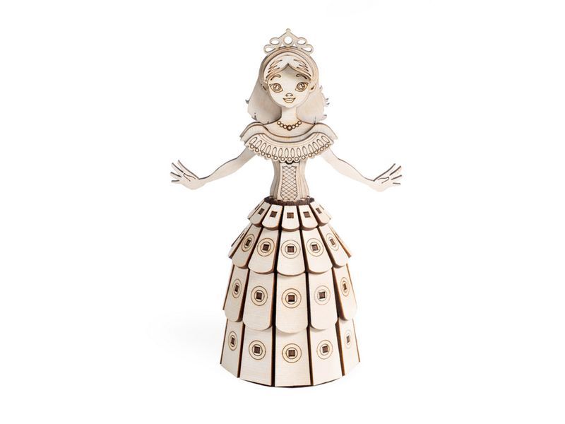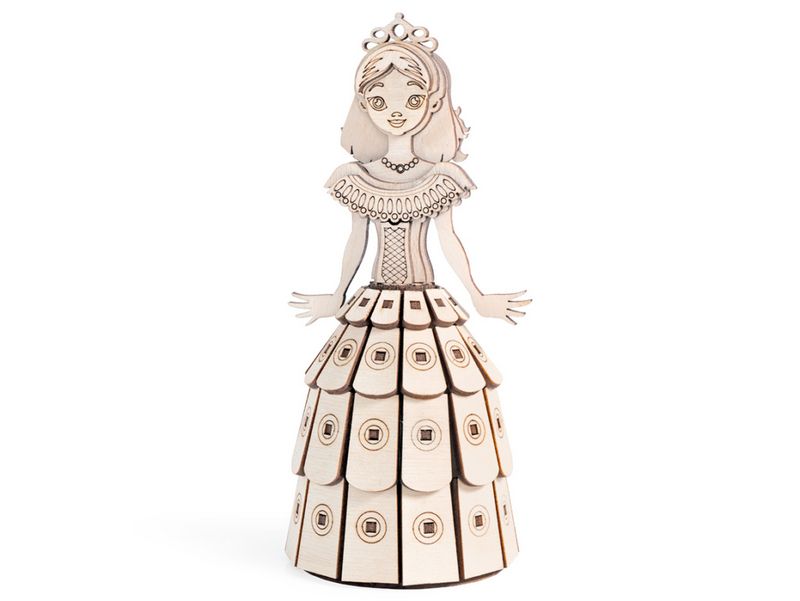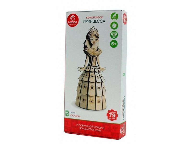 Деревянный 3D конструктор Lemmo Принцесса. Детали конструктора выполнены из качественной древесины. Набор укомплектован клеем ПВА и наждачной бумагой. В результате сборки получается полноценная красивая игрушка с подвижными элементами. После сборки при желании можно раскрасить акриловыми и гуашевыми красками.