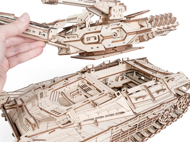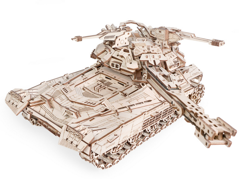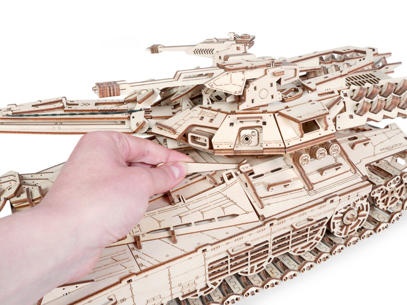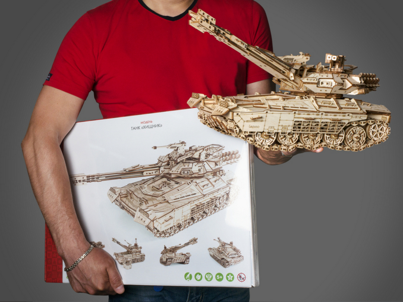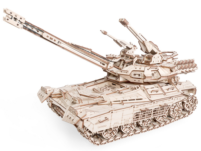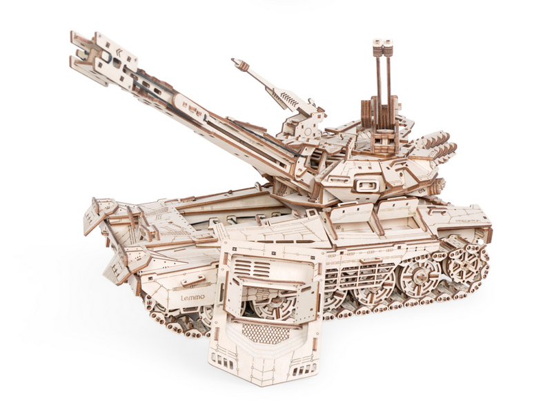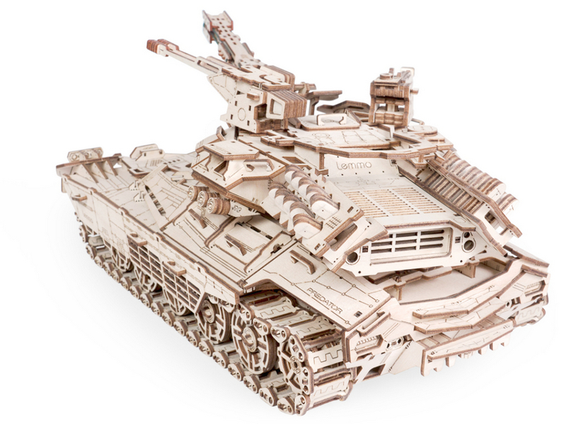 Деревянный 3D конструктор Lemmo Танк "Хищник". Детали конструктора выполнены из качественной древесины. Набор укомплектован клеем ПВА, резинками и наждачной бумагой. В результате сборки получается полноценная красивая игрушка с подвижными элементами. После сборки при желании можно раскрасить акриловыми и гуашевыми красками.