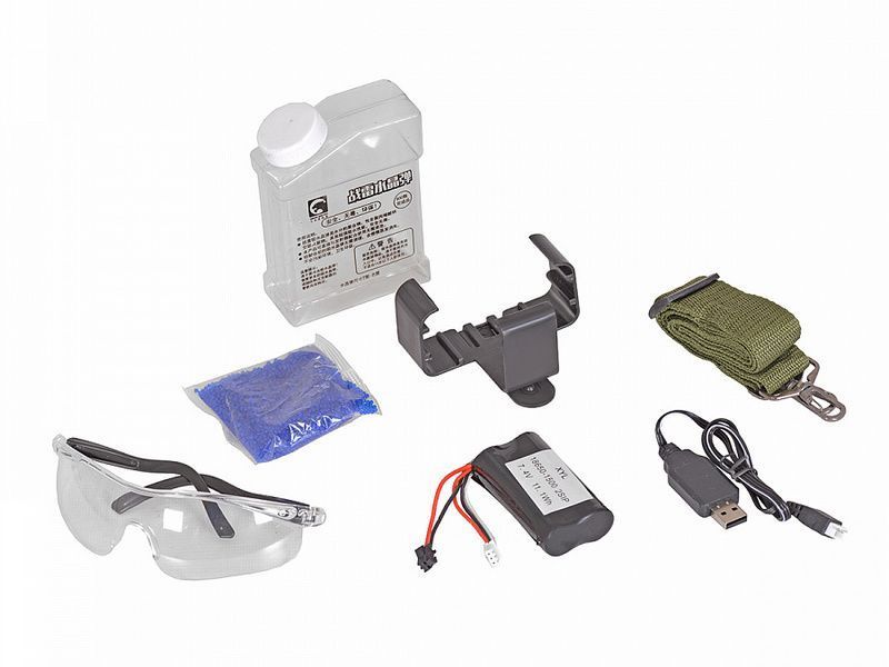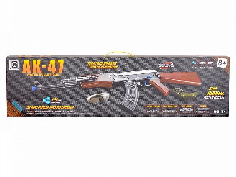 Детский автомат АК-47, стреляющий водными (гелевыми) пулями, на аккумуляторе. Два режима стрельбы: одиночный выстрел и выстрелы очередью. Дальность выстрела свыше 20 метров.