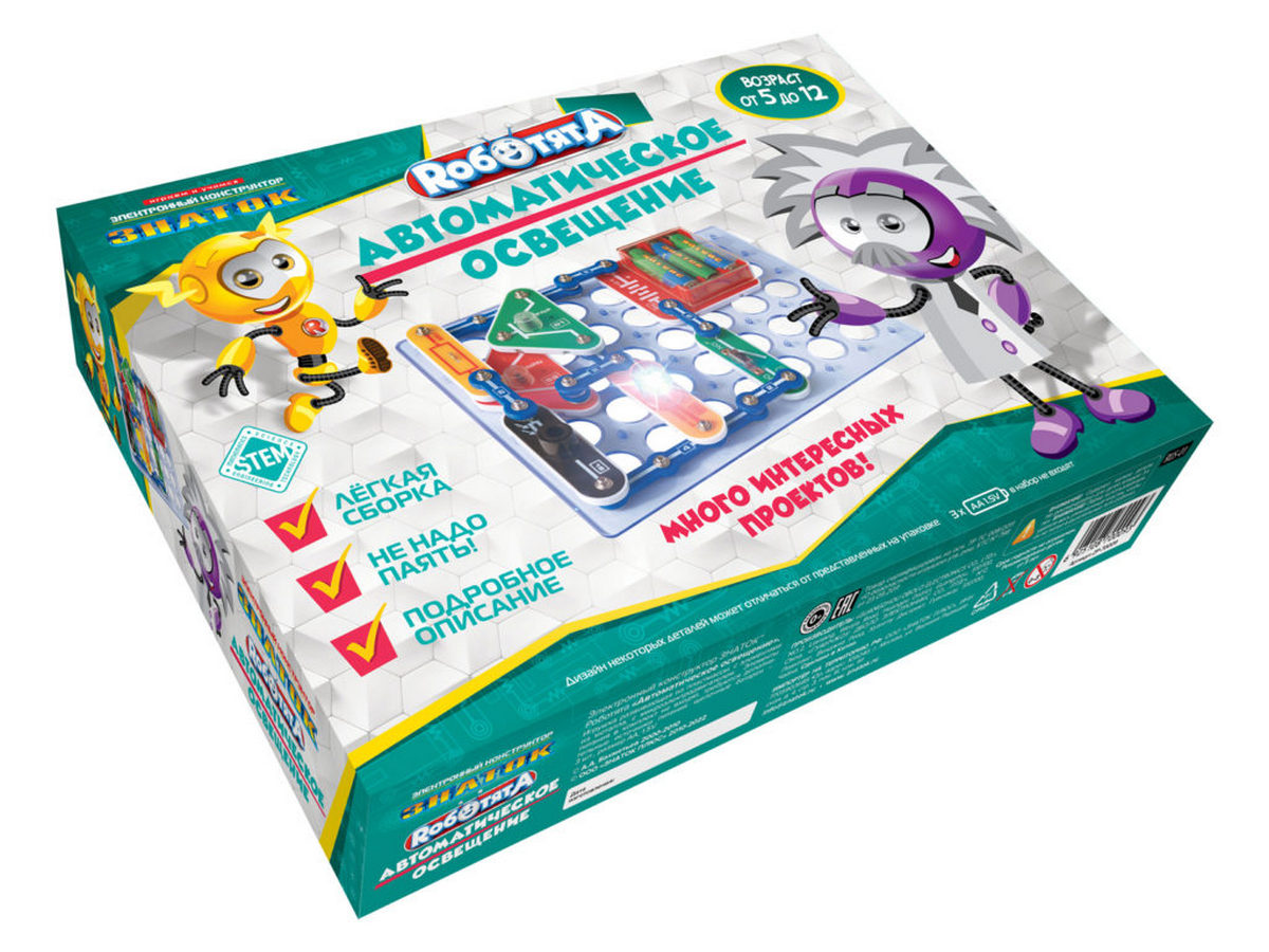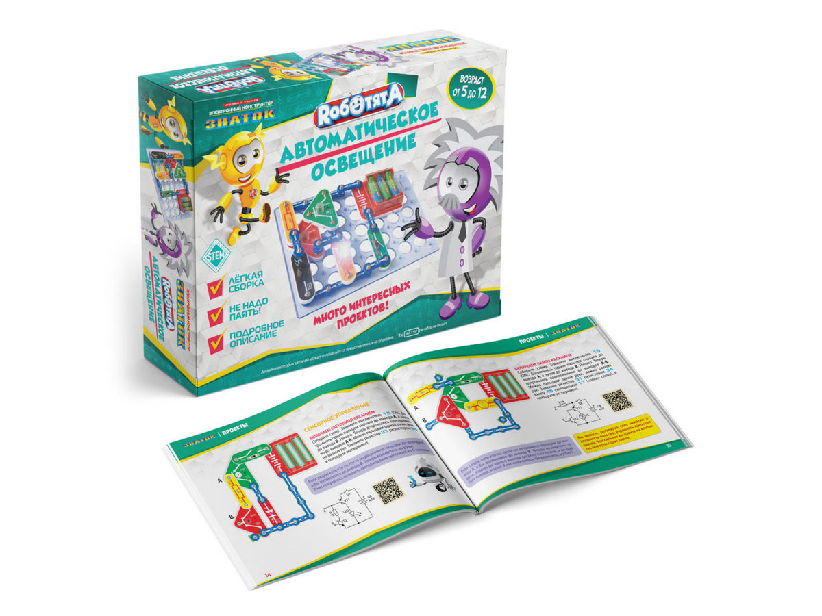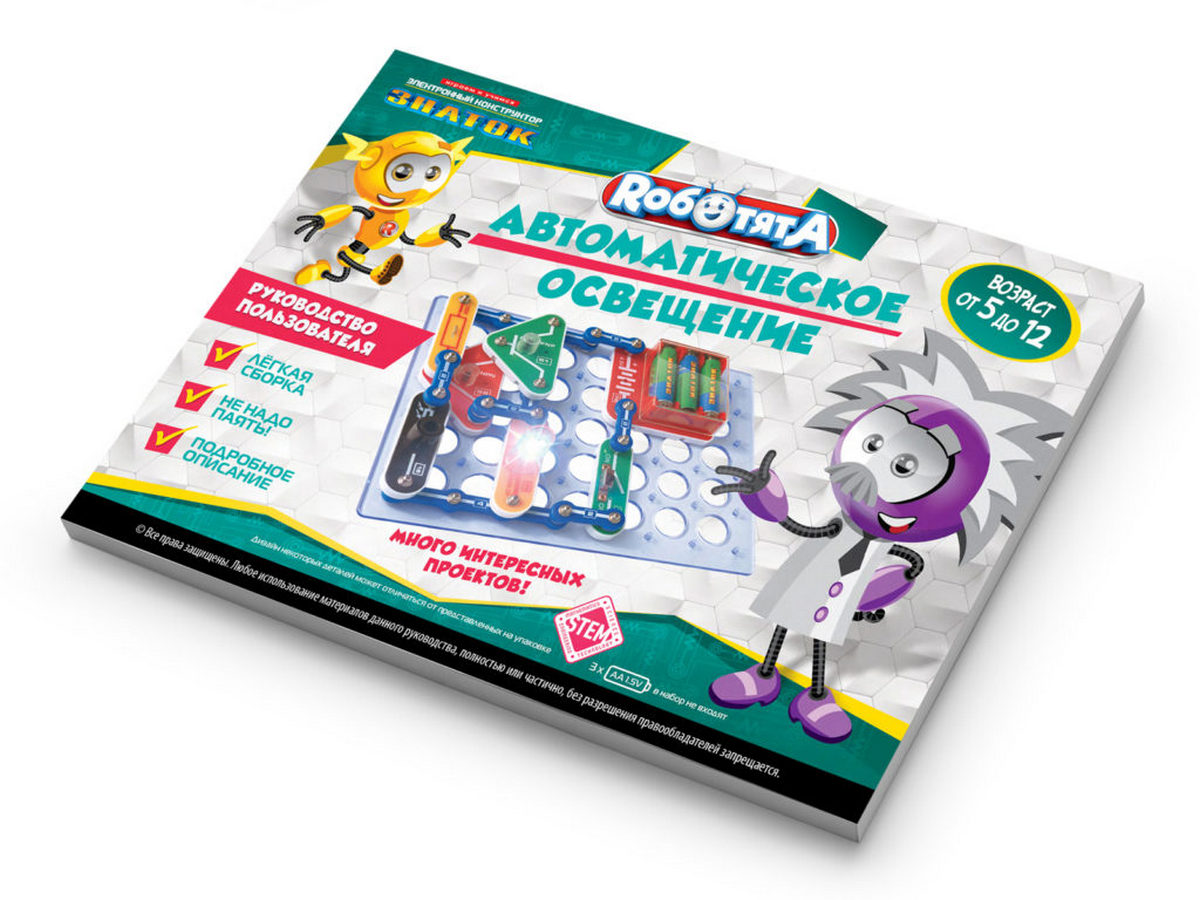 Электронный конструктор начального уровня, позволяющий ребёнку понять, как работают многие «умные вещи» вокруг нас, в частности, системы автоматического освещения, которые экономят электроэнергию и, следовательно, деньги. Даже без помощи взрослых, используя очень понятное цветное руководство, всего за несколько минут, он или она смогут собрать и испытать схему с практически 100% положительным результатом. Очень полезна будет подсказка в виде QR-кода, которую можно просмотреть при помощи смартфона или планшета.