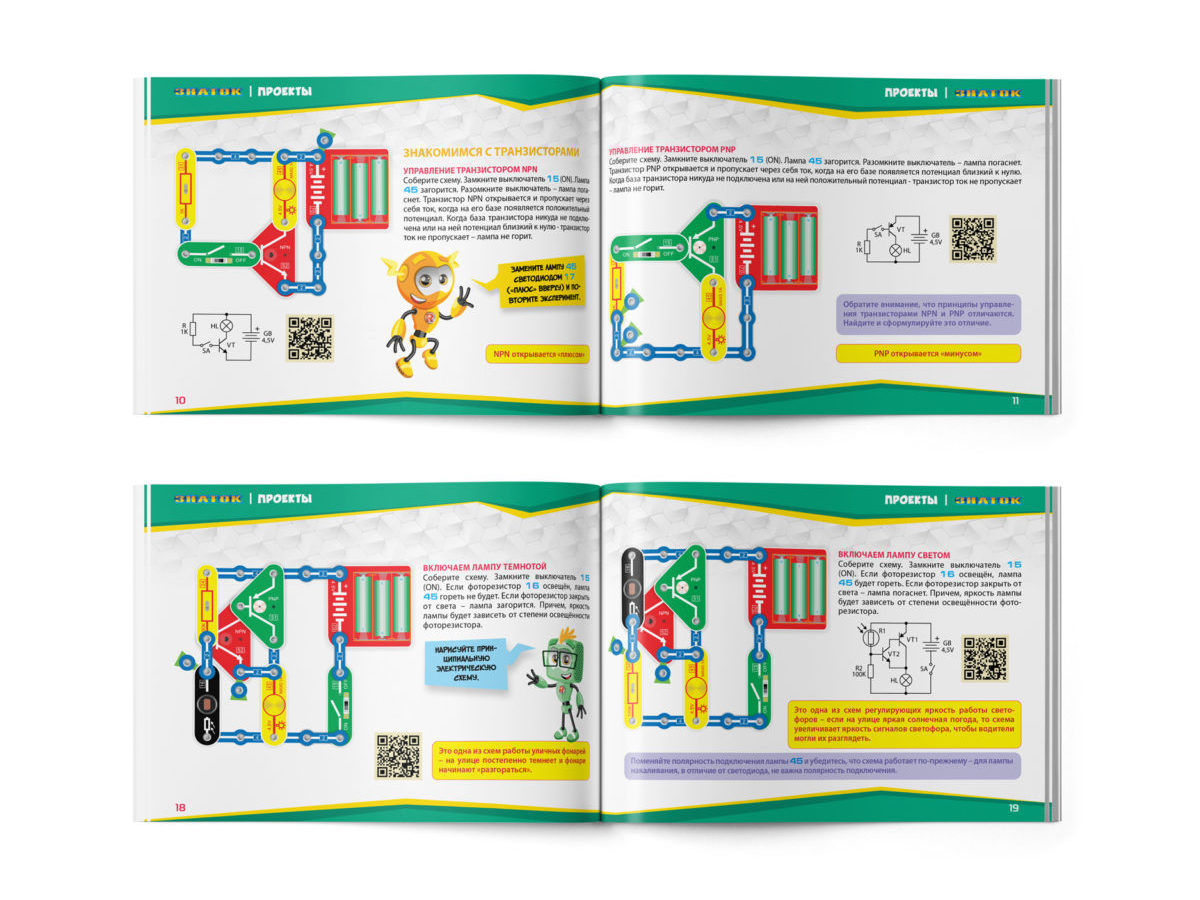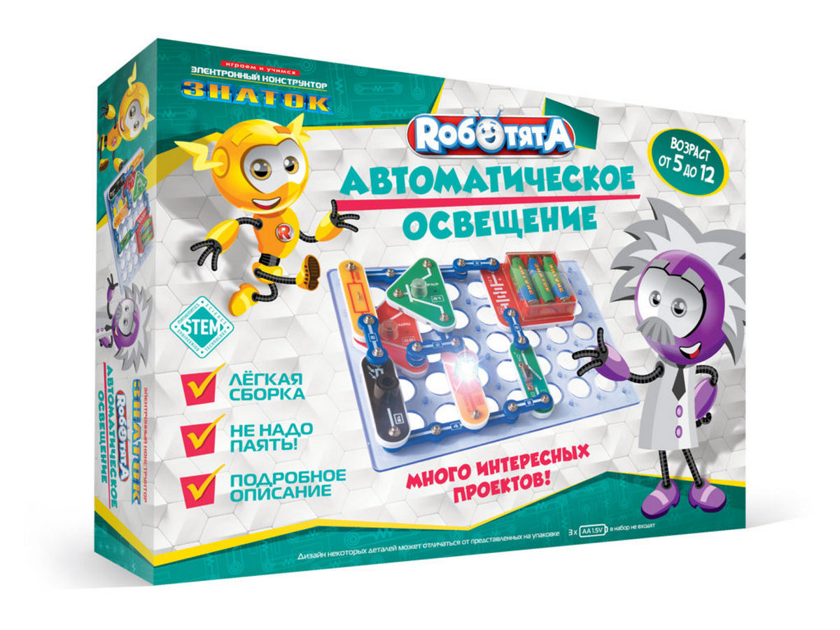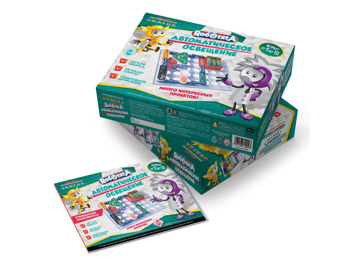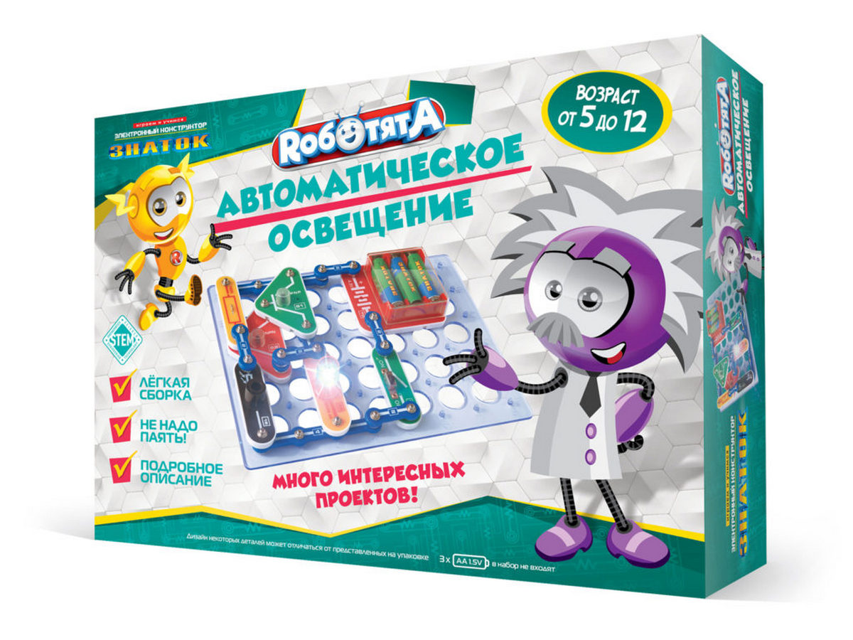 Электронный конструктор начального уровня, позволяющий ребёнку понять, как работают многие «умные вещи» вокруг нас, в частности, системы автоматического освещения, которые экономят электроэнергию и, следовательно, деньги. Даже без помощи взрослых, используя очень понятное цветное руководство, всего за несколько минут, он или она смогут собрать и испытать схему с практически 100% положительным результатом. Очень полезна будет подсказка в виде QR-кода, которую можно просмотреть при помощи смартфона или планшета.
