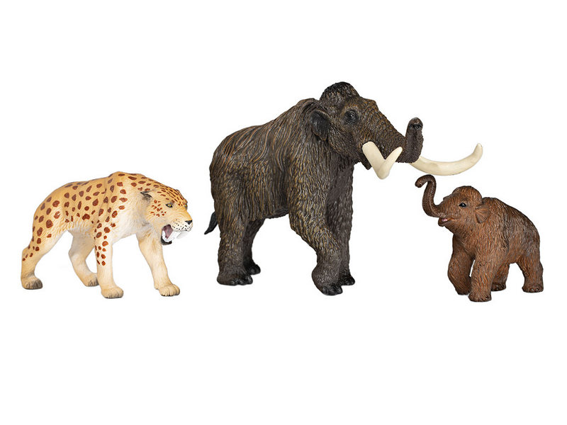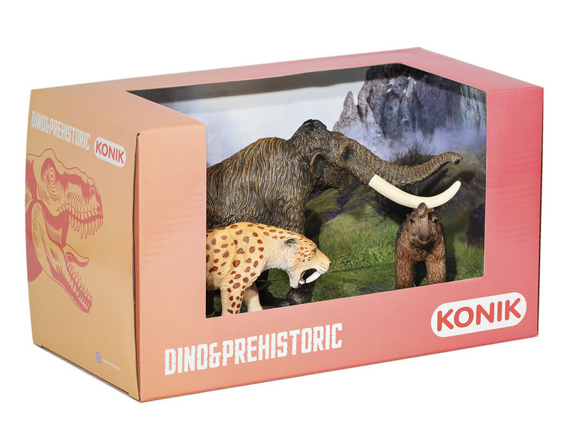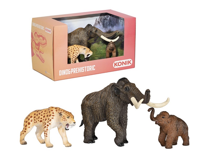 Набор фигурок доисторических животных от KONIK: мамонт, мамонтенок, смилодон. Фигурки животных смогут стать центральными персонажами детских игр и украсить интерьер комнаты. Игрушки предназначены для детей от 3 лет. Развивают мелкую моторику, воображение, фантазию и творческое мышление.