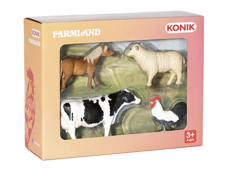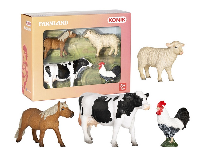 Набор фигурок животных фермы от KONIK: петух, овца, пони, корова. Фигурки животных смогут стать центральными персонажами детских игр и украсить интерьер комнаты. Игрушки предназначены для детей от 3 лет. Развивают мелкую моторику, воображение, фантазию и творческое мышление.