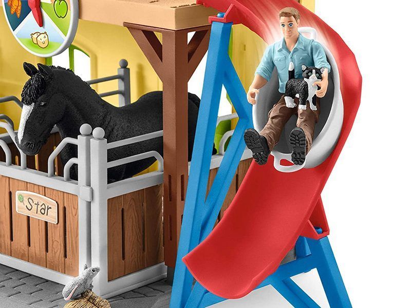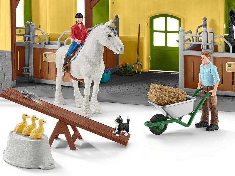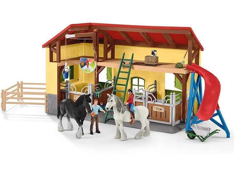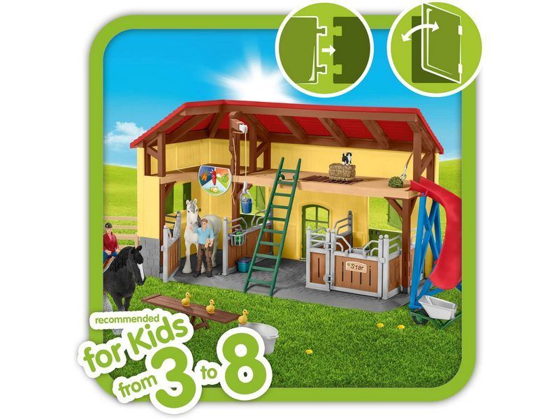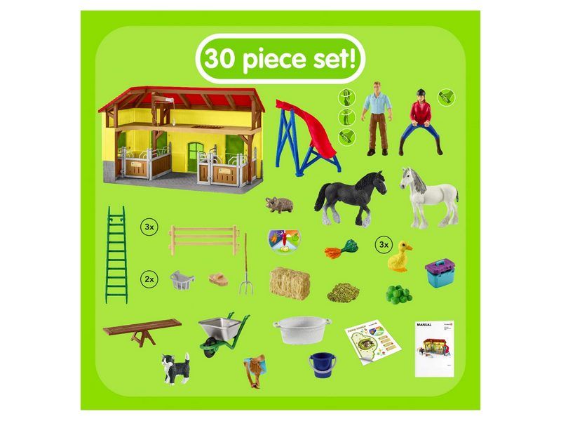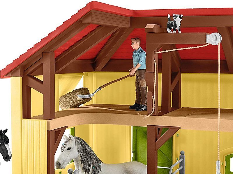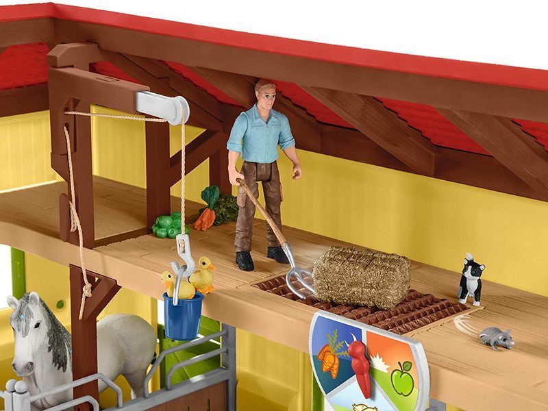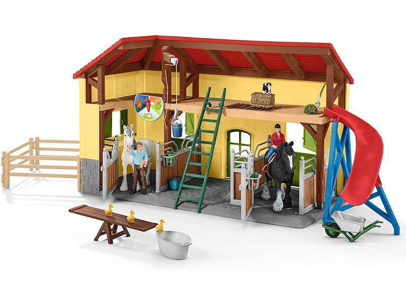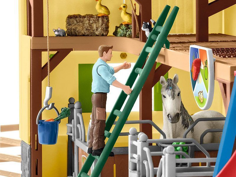 Конюшня Schleich с разными интересными функциями подарит детям много удовольствия от игры! Фермер Пауль и фермерша Лаура, 7 милых животных, 2 стойла и другие принадлежности для работы в конюшне позволят ребенку внести разнообразие в игру.