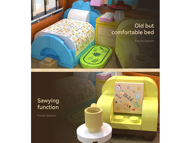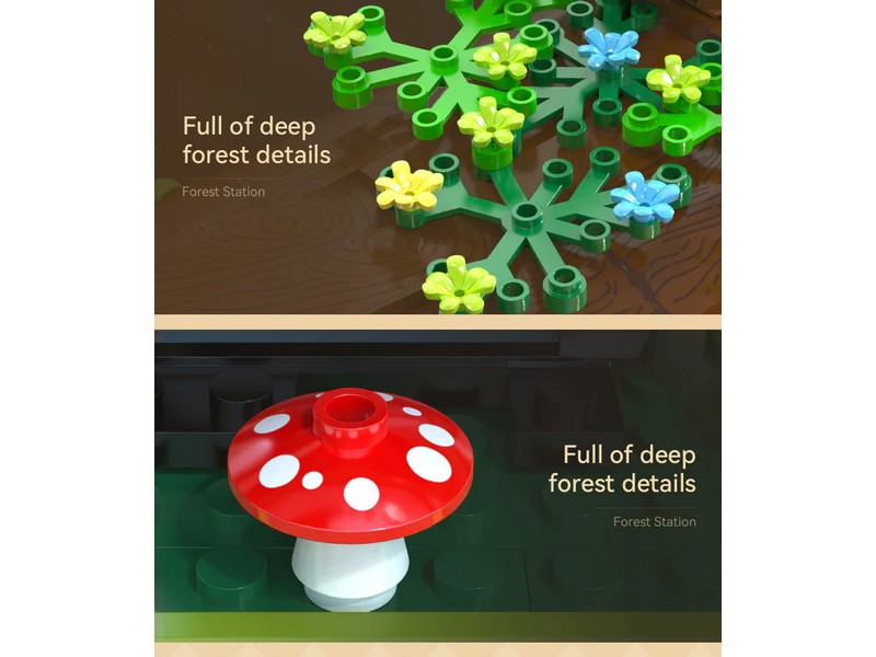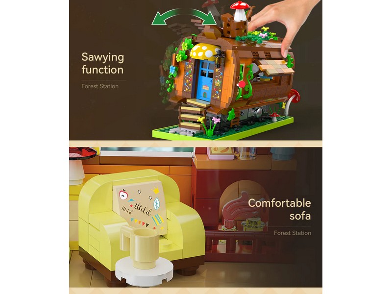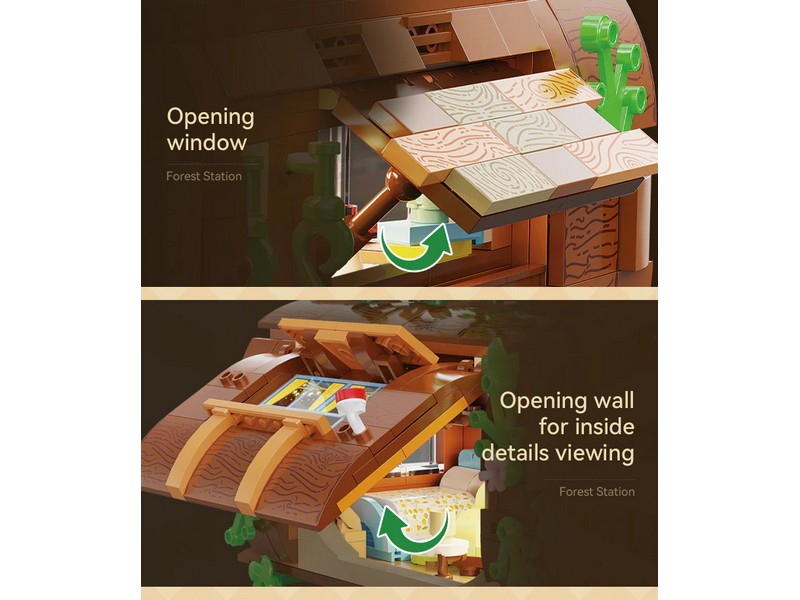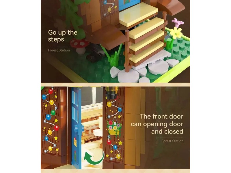 Модель создана с вниманием к деталям как снаружи, так и внутри здания. Набор содержит множество декоративных элементов, таких как: узоры дерева на блоках, лесная растительность, цветы, грибы, ступеньки.