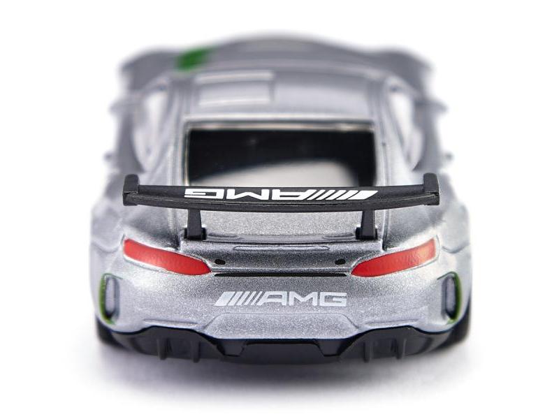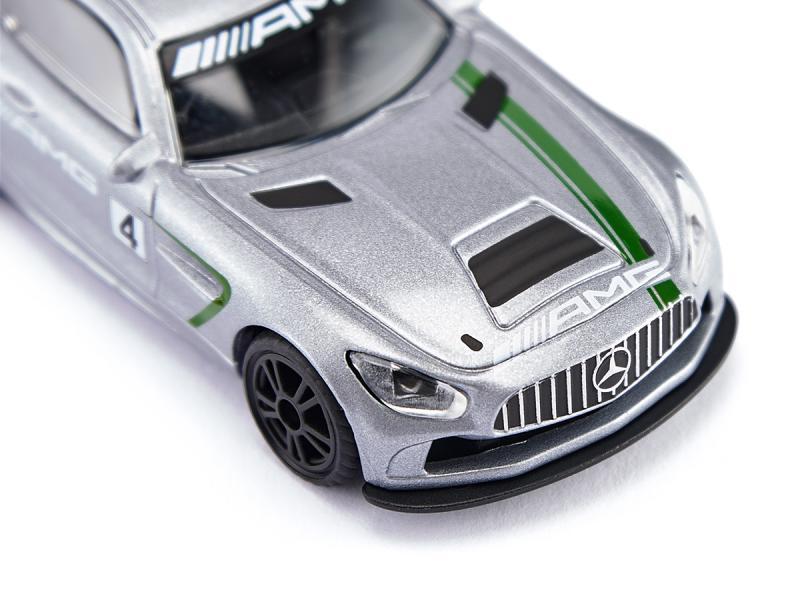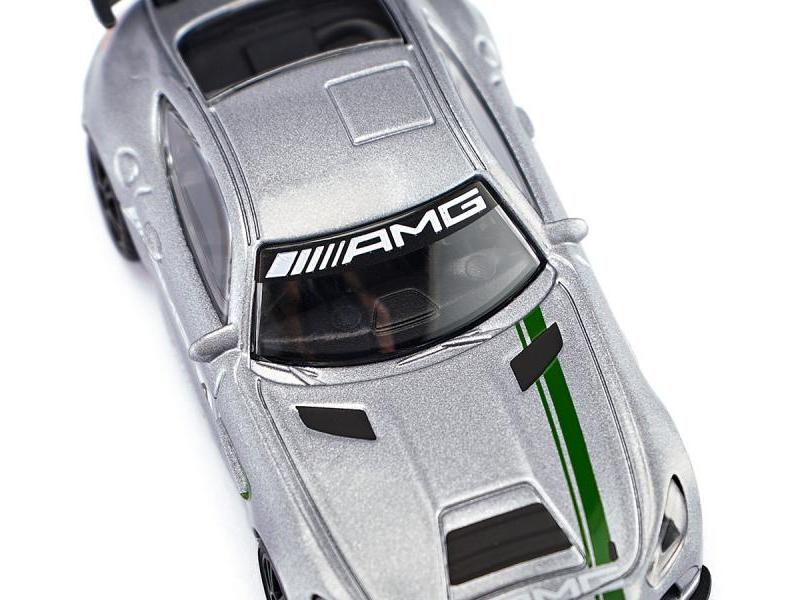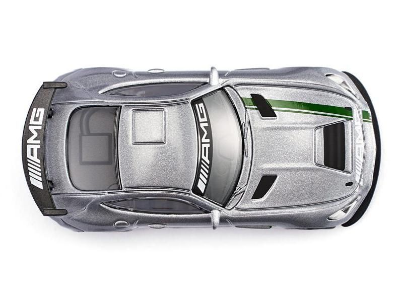 Модель гоночного автомобиля Mercedes-AMG со звездой на оригинальном лакокрасочном покрытии, как это было во время выкатывания на 24-часовую гонку в Спа-Франкоршам в 2017 году. Мощное заднее крыло обеспечивает прижимную силу на задней оси.
