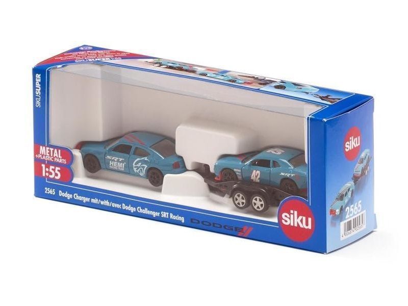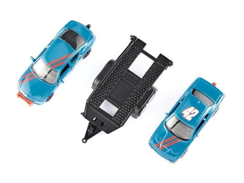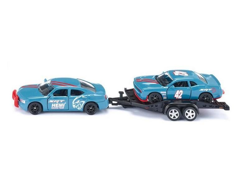 Гоночный комплект автомобилей с 8-цилиндровым двигателем. На автомобильном прицепе Dodge Charger тянет Dodge Challenger SRT Racing на следующий тест на треке. Прицеп медленно откидывается, и небесно-голубой монстр V8 откатывается назад. Дверь открыта, последние инструкции водителю. Стартовый номер 42 готов к разминке. Машина с рёвом выезжает с пит-лейна на трассу.