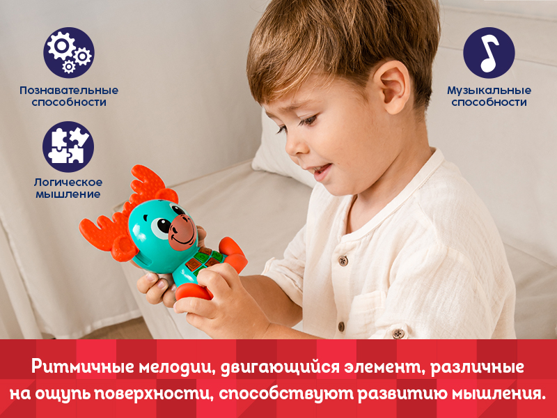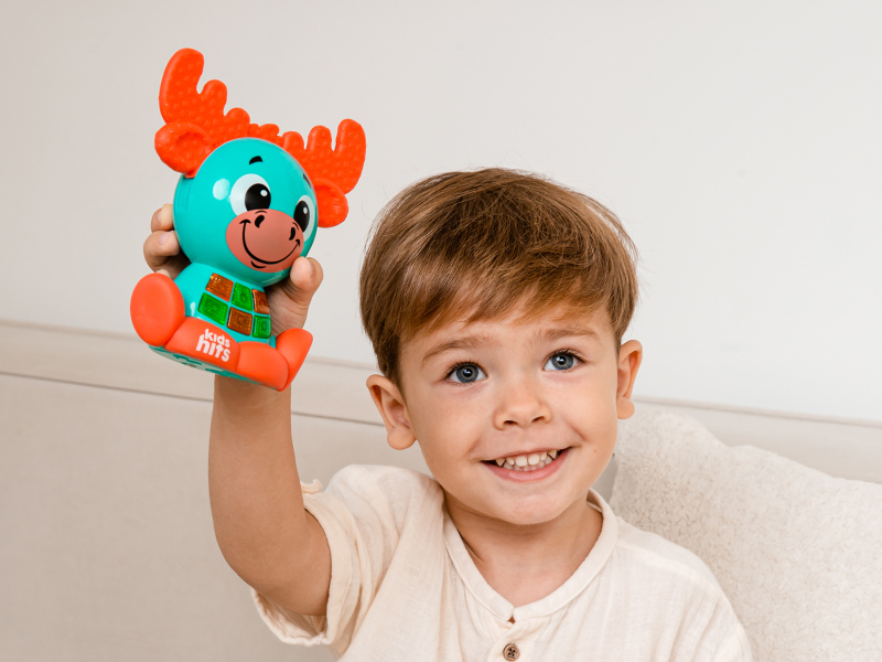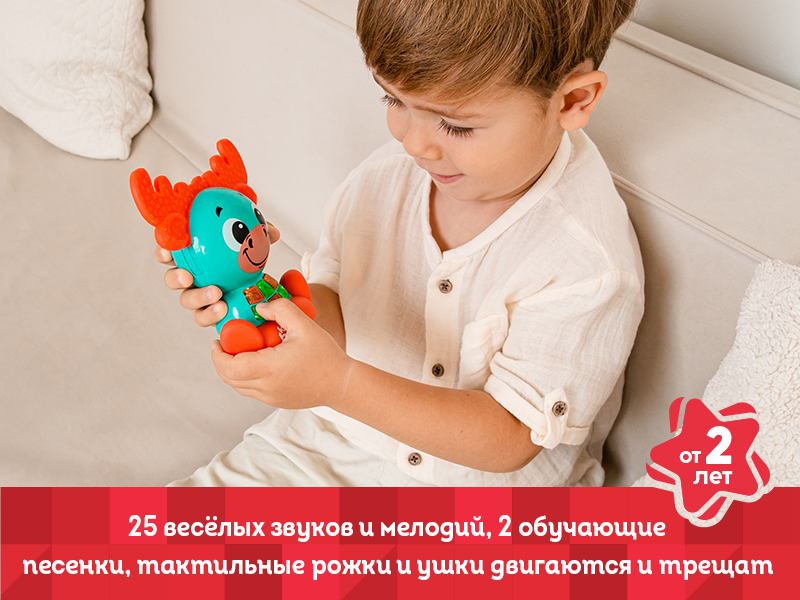 Интерактивная игрушка Kids Hits серии Кроха "Веселый лосенок" — это настоящая находка для маленьких исследователей! Лосенок привлекает внимание яркими огоньками, ритмичными мелодиями и разнообразными на ощупь поверхностями. Тактильные рожки и ушки не только добавляют интереса, но и веселят, шурша при прикосновении.