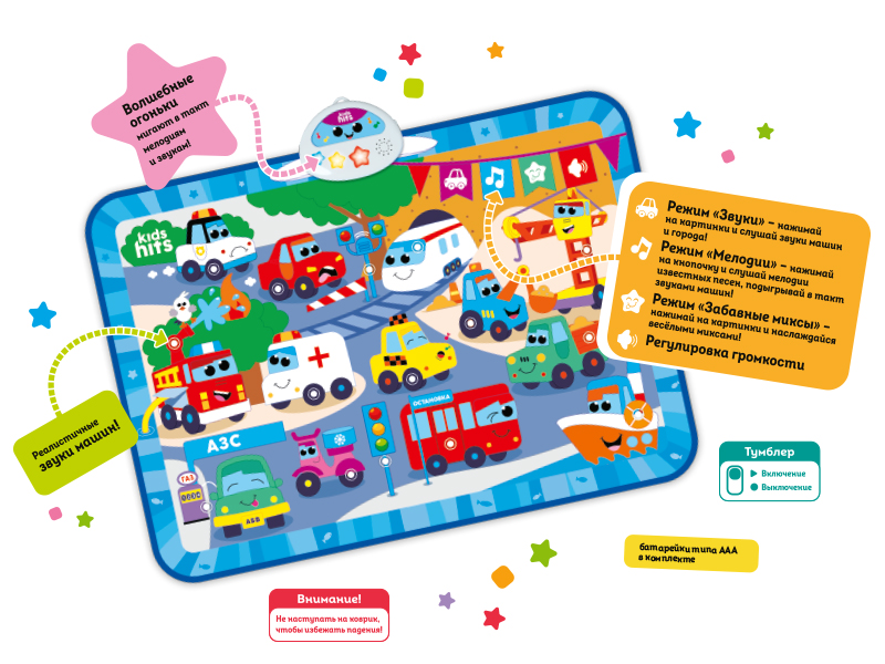 Коврик предлагает различные интересные режимы: Звук, Мелодии и Забавные миксы, которые будут развлекать и радовать юных исследователей. Слушая 15 звуков города, 15 забавных миксов и 7 известных мелодий, дети развивают познавательные способности и музыкальный слух. Каждое нажатие на коврик становится шагом к новым знаниям и открытиям.