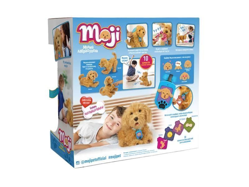 Моджи — интерактивный плюшевый щенок от американского бренда Skyrocket. Этот питомец совсем как настоящий: он откликается на имя, понимает голосовые команды, прикосновения, различает некоторые предметы, которые вы ему даёте. Моджи может сообщить своему хозяину, когда он хочет поиграть или проголодается — желания щенка отображаются на экране его ошейника, игрушка сама инициирует игру! В арсенале у Моджи более 150 реакций. С ним просто и понятно играть — с питомцем смогут взаимодействовать как самые маленькие, так и самые старшие. И вы сможете сами выбрать кличку для питомца, на которую пёс будет откликаться. Моджи, как и настоящий щенок, станет центром внимания всей семьи. В комплект входят аксессуары для реалистичной игры: миска для кормления, щётка для ухода, жевательная верёвка. Моджи вступает с ними в полноценное взаимодействие, например, грызёт верёвку или наклоняется в миску. Пёс понимает, что вы ему предлагаете — он распознаёт свои предметы и игрушки. С помощью игровых карточек, которые считываются ошейником, Моджи по-разному реагирует — рычит, лает, скулит. Ошейник Моджи оснащен интерактивным экраном, на котором транслируются мысли пса в виде анимированных эмоджи. Хозяин всегда знает, когда собаку пора кормить или, когда Моджи хочет играть. Этот мега умный пес будет выполнять порядка 19 команд: он умеет давать лапу, защищать, садиться, ложиться и многое другое. Моджи — добрый, умный и активный питомец с нежной шёрсткой — идеальный подарок для детей, которые мечтают о собаке.