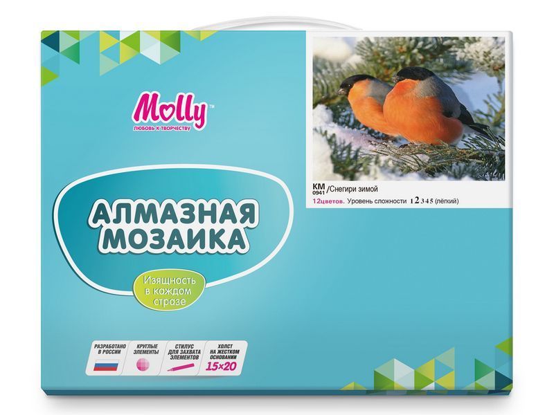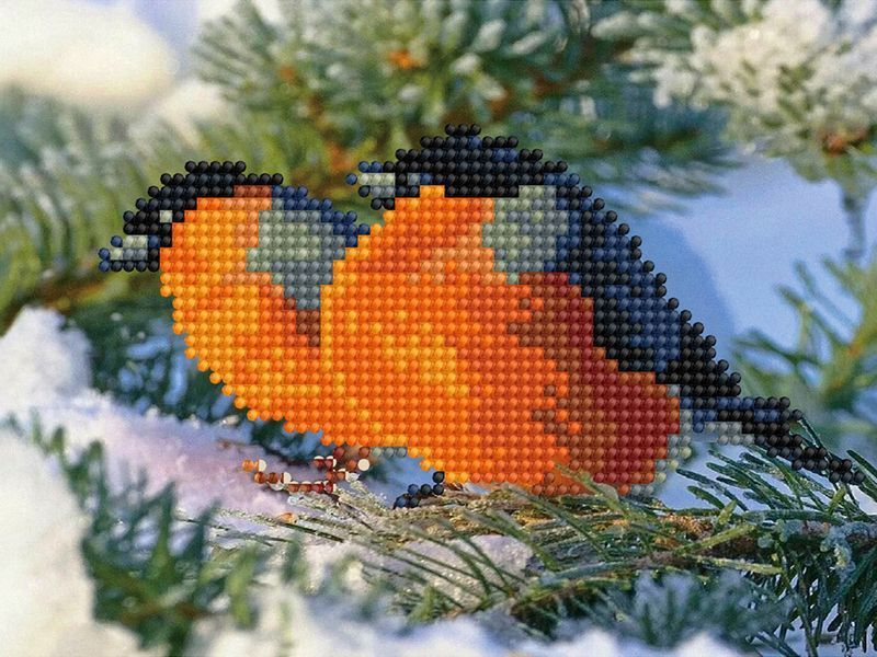 В наборе "Снегири зимой" из мозаичных элементов на холсте можно выложить яркую картину зимнего дня со снегирями. В Европе снегирей часто держат в качестве певчих птиц.